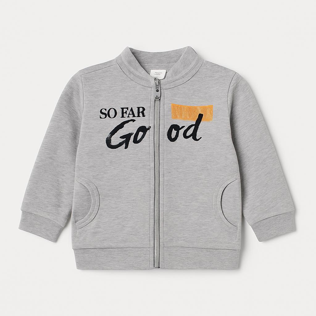 Questo adorabile giubbottino grigio, perfetto per i più piccoli, è una scelta ideale per le fresche giornate di gioco! Realizzato in morbido cotone, offre calore e comfort. La chiusura a zip lo rende facile da indossare e togliere, mentre il design è arricchito dalla scritta “SO FAR SO GOOD” in un mix di colori che cattura l’attenzione. Le maniche elastiche e il taglio pratico lo rendono adatto a qualsiasi outfit, dal look sportivo a quello più casual. Nonostante sia un capo usato, è in ottime condizioni e pronto a diventare un compagno di avventure per il tuo bimbo!