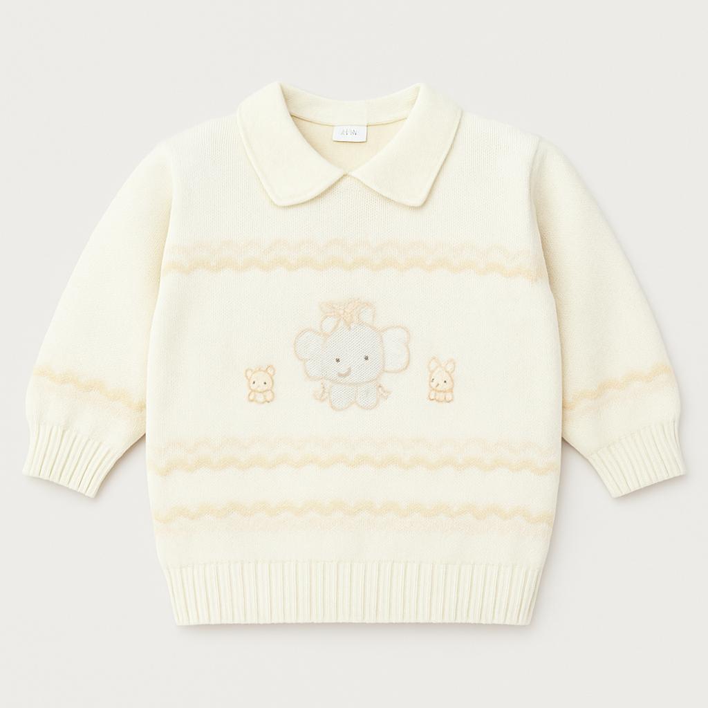 Questo adorabile maglioncino è un tenero abbraccio per i bambini! Realizzato in un morbido tessuto in tonalità neutra, presenta un delicato colletto che aggiunge un tocco di eleganza. Il simpatico ricamo centrale di un tenero orsetto e piccole sagome di coniglietti porta un sorriso di gioia. Le maniche lunghe garantiscono calore e comfort per le giornate più fresche. Nonostante sia un capo usato, si presenta in ottime condizioni, pronto a diventare il preferito nella moda del tuo piccolo. Perfetto per creare look coccolosi e raffinati!
