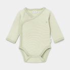 Ce body adorable à manches longues est le compagnon idéal de votre tout-petit ! Confectionné en coton doux à rayures vert clair, il est agréable pour la peau et parfait en toute saison. Son encolure cache-cœur avec boutons-pression facilite le change. Les manches longues sont parfaites pour les fraîches journées de printemps ou pour rester bien au chaud à la maison. Bien qu'il soit d'occasion, il est en excellent état et prêt à accueillir un nouveau bébé. Un ajout pratique et élégant à la garde-robe de votre enfant !