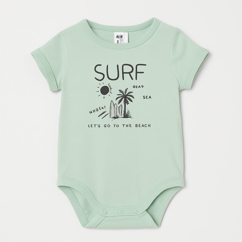 Cette adorable grenouillère vert menthe est parfaite pour les petits amoureux de la plage ! Ornée du slogan « SURF » et d'illustrations de soleil et de palmiers, elle évoque des journées de détente et de joie au bord de l'eau. Confectionnée en coton doux, elle offre confort et liberté de mouvement pour les aventures estivales. Ses manches courtes et sa coupe pratique la rendent idéale pour jouer et se relaxer. Bien qu'ayant déjà servi, elle est en excellent état et prête à accompagner votre enfant pour un été inoubliable ! Une pièce polyvalente et stylée, parfaite pour tous les petits explorateurs !