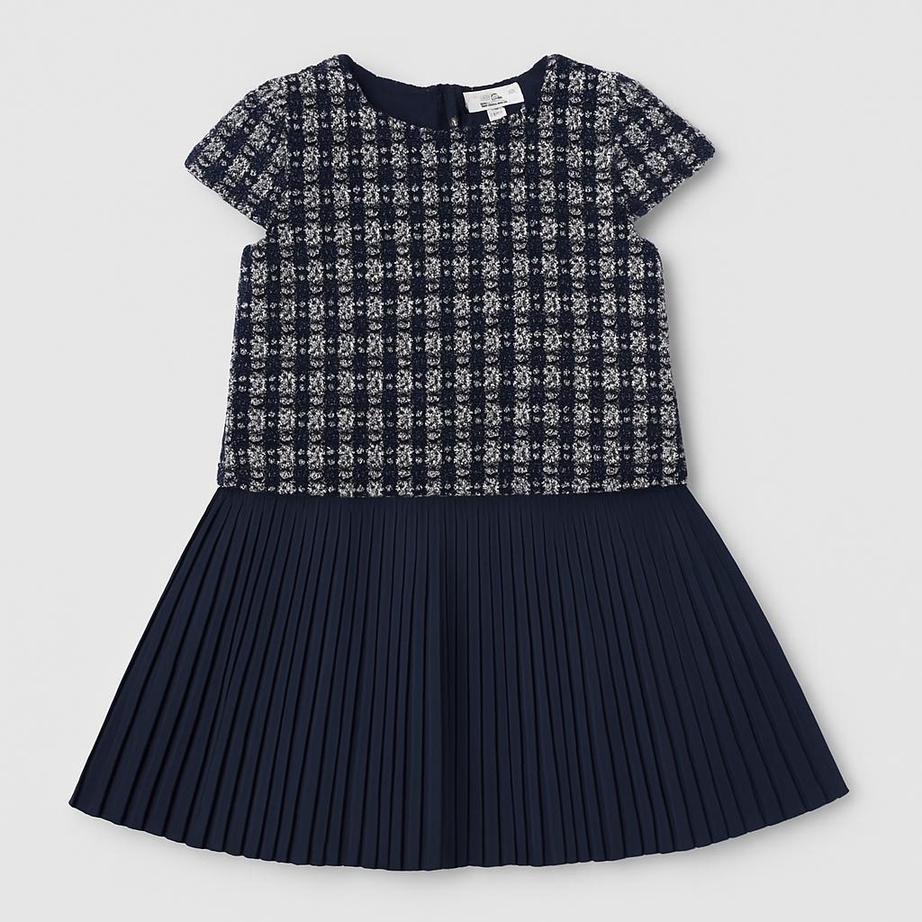 Cette robe ravissante et élégante est parfaite pour faire briller toutes les petites princesses ! Avec son haut bleu foncé à carreaux vichy blancs délicats et sa jupe plissée fluide, elle offre une allure à la fois sophistiquée et espiègle. Les manches courtes et le col rond ajoutent une touche chic, la rendant idéale pour les fêtes, les occasions spéciales ou une simple sortie. Bien qu'elle soit d'occasion, elle est en excellent état et prête à émerveiller ! Une robe qui allie style et confort, pour des moments magiques à chaque pas.