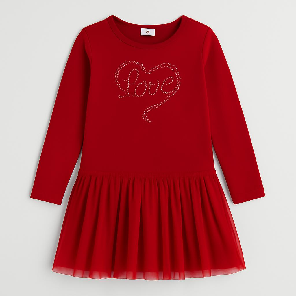 Cette ravissante robe rouge de PULL&BEAR est parfaite pour les petites princesses ! Avec son corsage à manches longues et sa jupe vaporeuse en tulle, elle est ornée d'un imprimé « Love » en strass étincelant qui scintille à chaque mouvement. Son coton chaud assure un confort optimal par temps frais, ce qui la rend idéale pour les fêtes, les anniversaires ou les moments de jeu. Bien qu'elle soit d'occasion, elle est en excellent état et prête à ajouter une touche de magie à la garde-robe de votre petite fille ! Un parfait mélange d'élégance et de fantaisie !