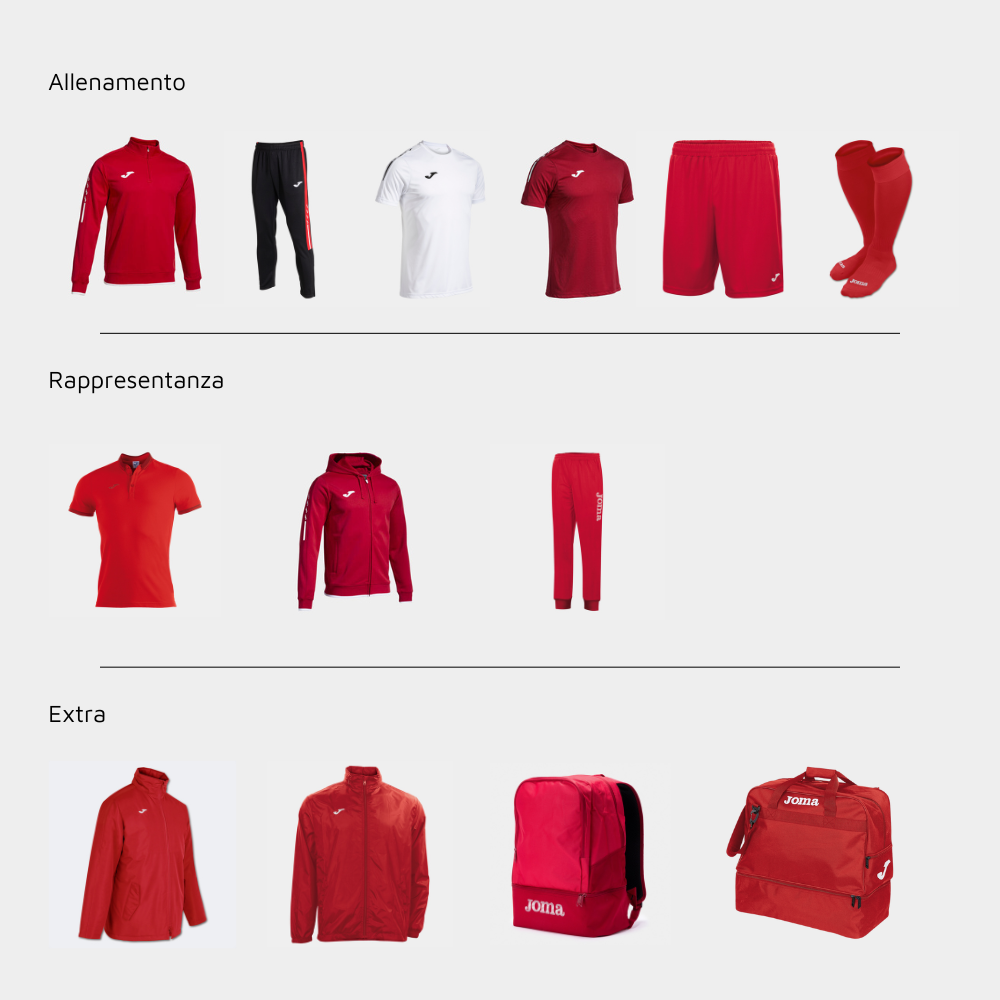 Il Fornitore offre un kit completo di abbigliamento sportivo, che comprende magliette, felpe, pantalone, giaccone, k-way, borsa e calzettoni. Il cliente può scegliere a piacere il numero di capi e la tipologia. La selezione dei capi avviene a maggio e la consegna entro la fine di agosto.