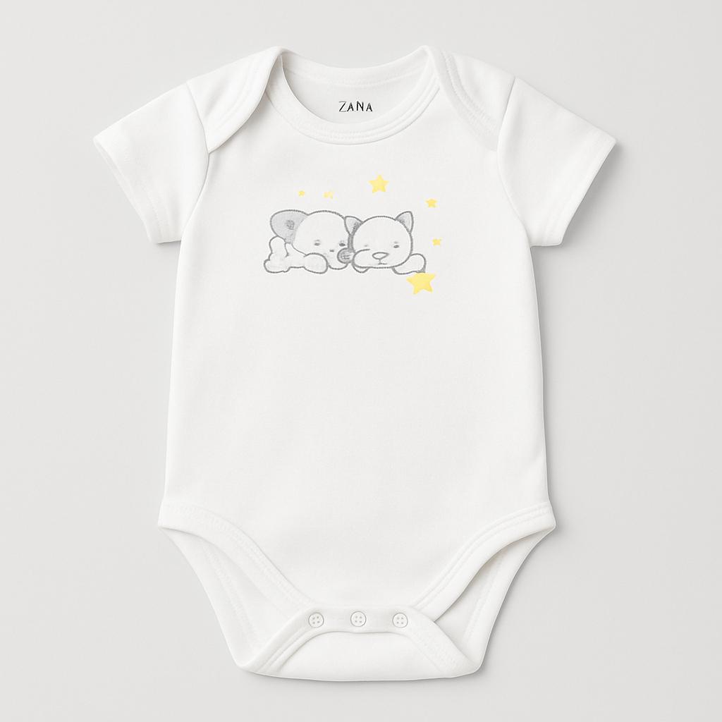 Questo adorabile body per neonati è un vero sogno di morbidezza! Realizzato in cotone delicato, presenta un delizioso motivo con due dolci orsetti che si abbracciano, circondati da stelle dorate. Le maniche corte e il bottone a pressione rendono il cambio rapido e pratico, mentre il colore bianco puro è perfetto per ogni occasione. Anche se è un capo usato, si presenta in ottime condizioni, pronto a coccolare il tuo piccolo! Un'incredibile scelta per comfort e stile!