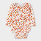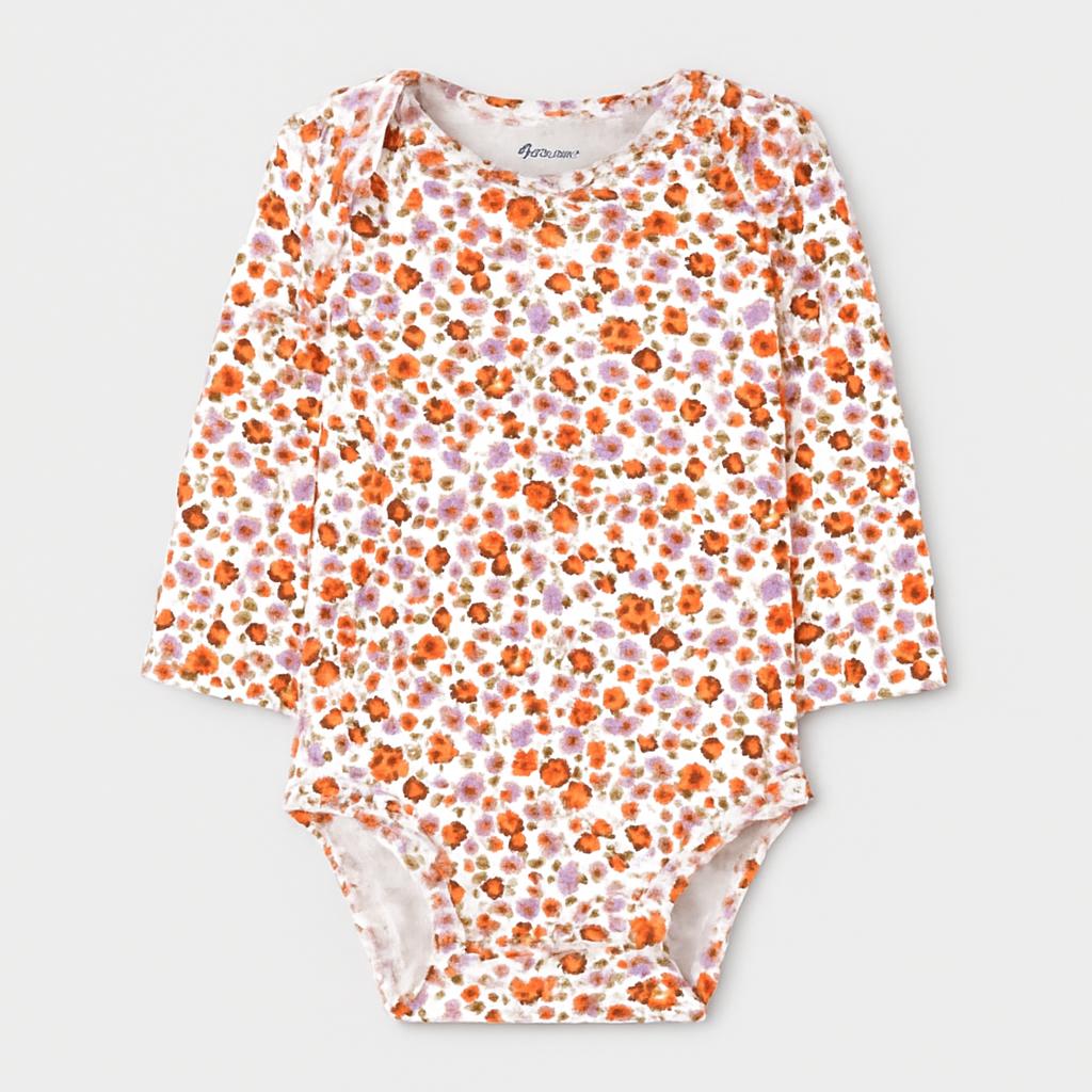 Delizioso body di Carter's, perfetto per la tua piccolina! Con un dolce motivo floreale nei toni dell'arancione e del lilla, questo capo sprigiona freschezza e allegria. Realizzato in morbido cotone, è comodo e delicato sulla pelle. Le maniche lunghe lo rendono ideale per le fresche giornate primaverili, mentre i bottoni sul fondo facilitano il cambio. Nonostante sia un capo usato, si presenta in ottime condizioni, pronto per accompagnare la tua bimba in tante avventure! Un must-have per un look semplice ma super carino!