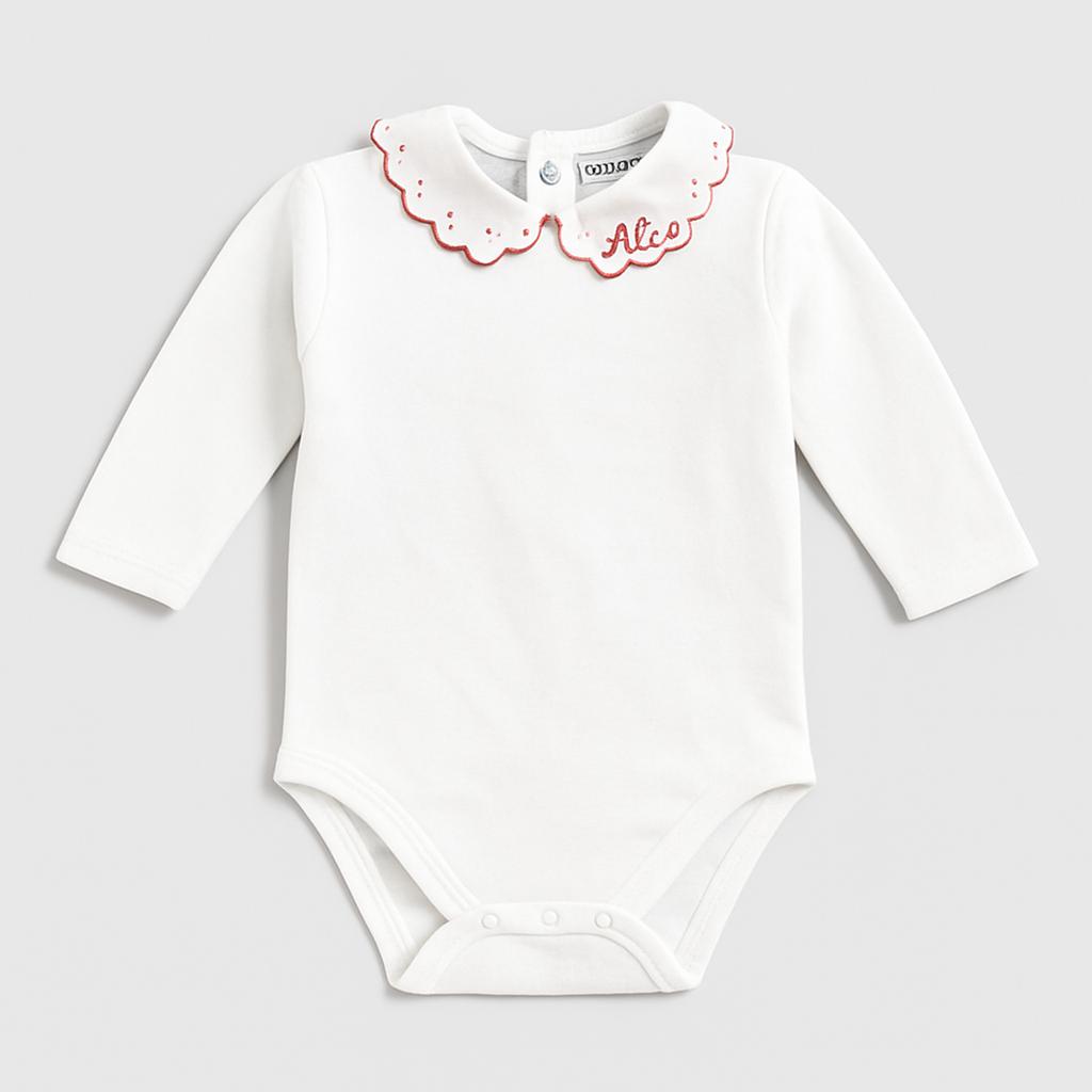 Questo adorabile body a maniche lunghe è perfetto per la tua piccola! Realizzato in morbido cotone bianco, il design semplice è arricchito da un delizioso colletto ricamato, che aggiunge un tocco di eleganza. La scritta "Alice" in rosso sul colletto personalizza il look, rendendolo unico e speciale. Le chiusure a bottoni sul fondo facilitano il cambio, mentre le maniche lunghe lo rendono ideale per le giornate fresche. Nonostante sia un capo usato, si presenta in ottime condizioni, pronto per essere indossato con stile! Un must-have per le piccole fashioniste!