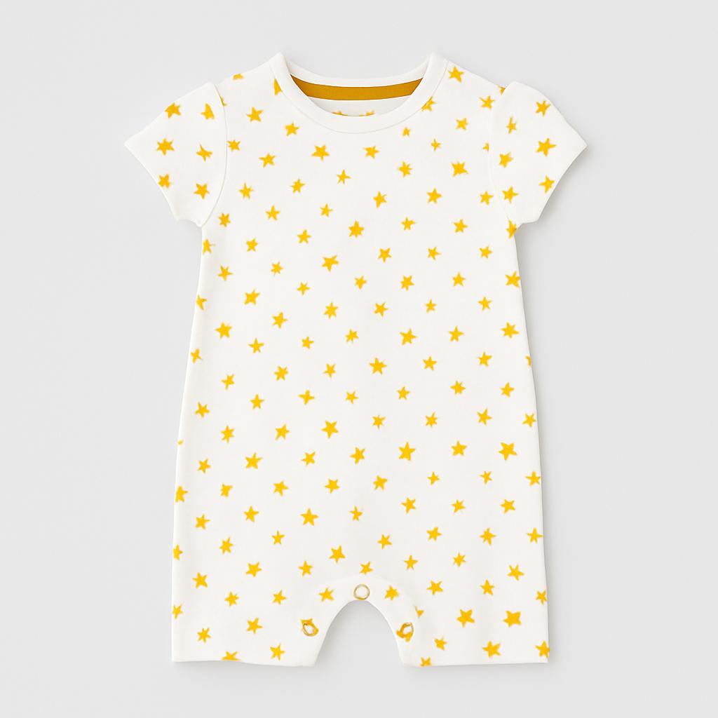 Questo adorabile body per bambini, perfetto per i più piccoli, è un concentrato di dolcezza e comfort! Realizzato in morbido cotone, è decorato con un allegro motivo di stelle gialle su uno sfondo bianco. Le maniche corte e la vestibilità pratica lo rendono ideale per le giornate estive, mentre i bottoncini sul fondo facilitano il cambio del pannolino. Anche se usato, si presenta in ottime condizioni, aggiungendo un tocco di magia al guardaroba del tuo bimbo. Un must per i mini esploratori che adorano muoversi liberi e giocare!