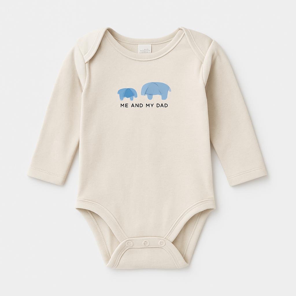 Questo adorabile body a maniche lunghe, in morbido cotone beige, è perfetto per il tuo piccolo! Sul fronte, una tenera grafica blu con due elefanti e la scritta "ME AND MY DAD" aggiunge un tocco affettuoso e giocoso. Ideale per le giornate fresche, il body è facile da indossare grazie ai pratici bottoncini sul fondo. Nonostante sia un capo usato, è in buone condizioni e pronto per essere indossato con amore. Un capo perfetto per creare ricordi speciali tra papà e bambino!