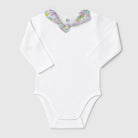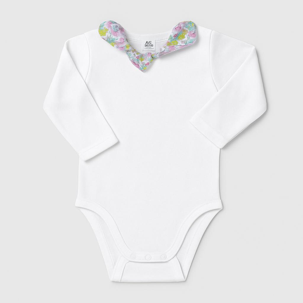 Questo adorabile body bianco per neonati è un capo essenziale per il guardaroba dei più piccoli! Realizzato in morbido cotone, offre comfort e libertà di movimento. Le maniche lunghe lo rendono perfetto per le stagioni fresche. La particolarità di questo body è il colletto impreziosito da un delizioso motivo floreale in tonalità pastello, che aggiunge un tocco di dolcezza e stile. Ideale per le giornate in casa o per uscite speciali, è un capo usato ma in ottime condizioni, pronto per vestire il tuo piccolo con eleganza e tenerezza!