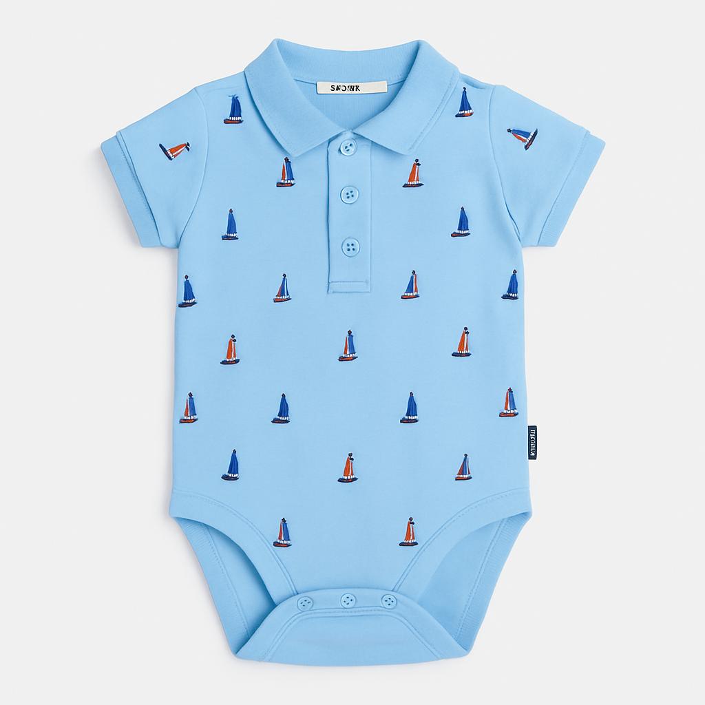 Questo adorabile body di colore azzurro è perfetto per i piccoli marinai! Realizzato in morbido cotone, è decorato con un delizioso motivo di barche a vela colorate che porta un tocco di avventura. I piccoli bottoni sul colletto donano un tocco elegante, mentre le maniche corte lo rendono ideale per le giornate calde. Facile da indossare e pratico, è un capo usato in ottime condizioni. Uno stile casual e giocoso che farà felici i genitori e i piccoli esploratori!