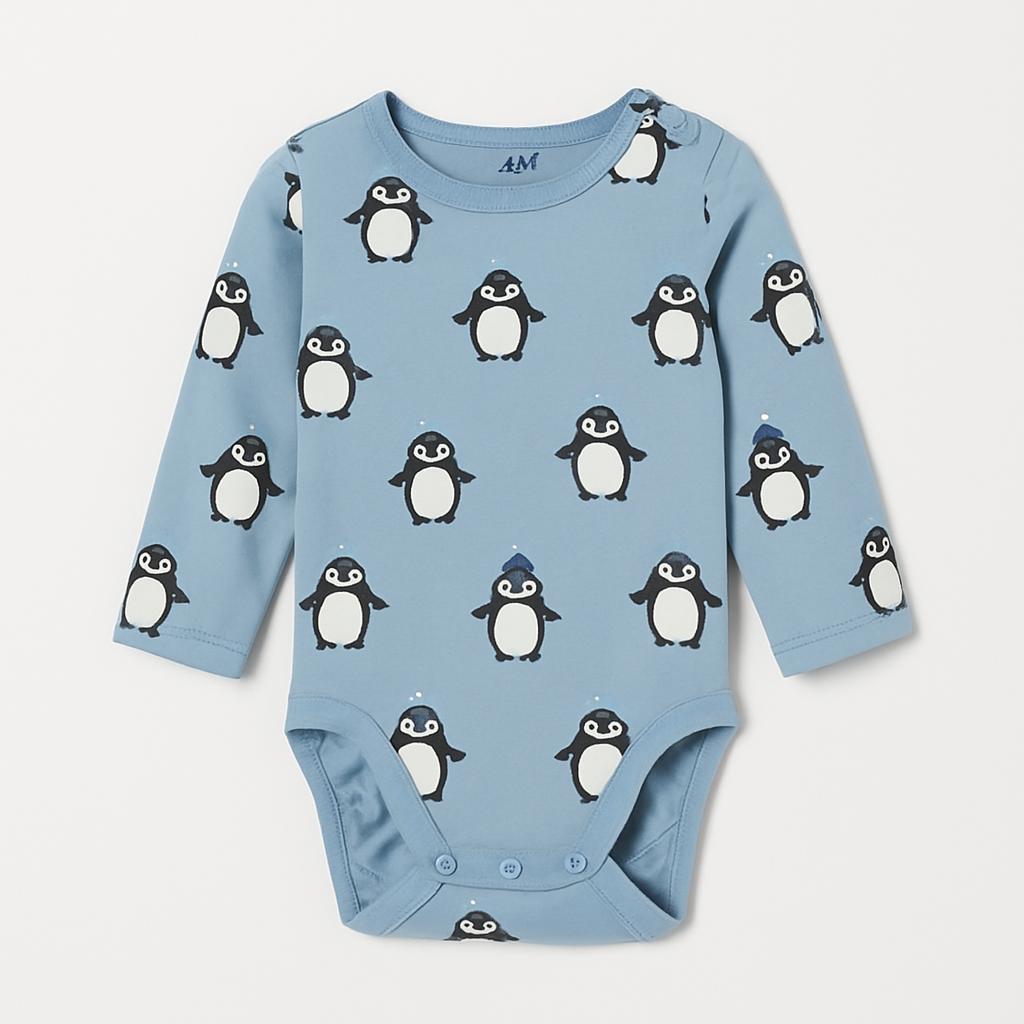 Questo adorabile body di H&M è perfetto per i piccoli amanti degli animali! Realizzato in morbido cotone, presenta un dolcissimo motivo con pinguini che ballano sullo sfondo azzurro. Con maniche lunghe e bottoni a pressione sul fondo, garantisce praticità e comfort durante il gioco e le passeggiate. Nonostante sia un capo usato, è in ottime condizioni e pronto ad accompagnare ogni avventura del tuo bimbo. Un'aggiunta divertente e carina al guardaroba!