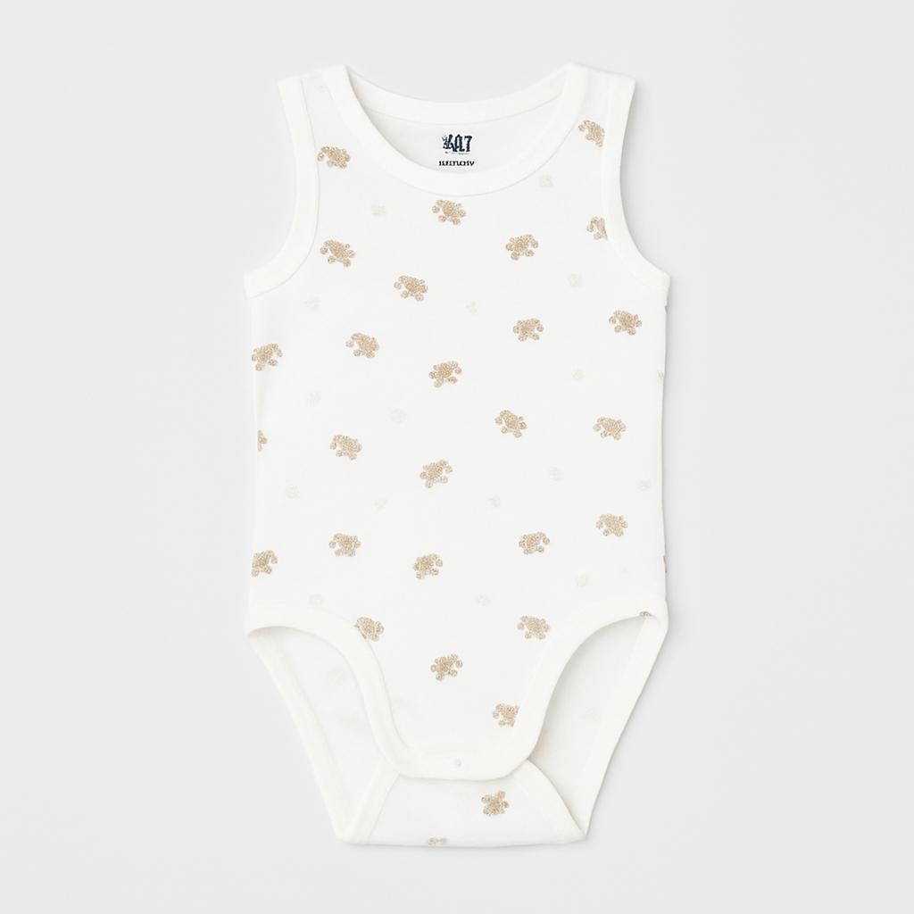 Questo adorabile body smanicato di H&M è un capo must-have per i più piccoli! Realizzato in morbido cotone, è decorato con un dolce motivo di elefantini che porterà un sorriso sul viso del tuo bambino. Il suo colore bianco luminoso e il design semplice lo rendono perfetto per ogni occasione, da un pigiamino a un outfit casual per le giornate estive. Facile da indossare e pratico per il cambio, questo body è un'ottima scelta per garantire comfort e stile. Anche se usato, è in ottime condizioni e pronto a diventare il preferito del guardaroba del tuo piccolo!