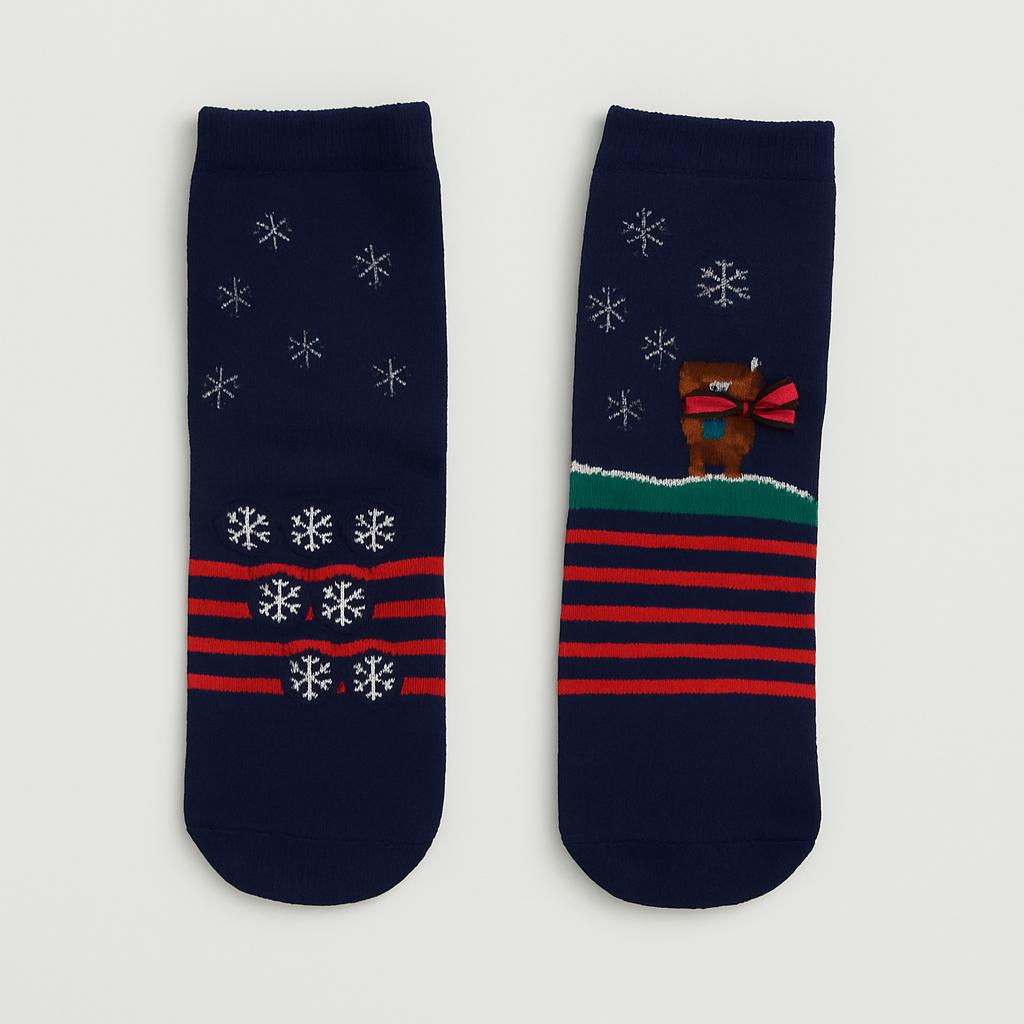 Questi calzini invernali sono un vero incanto per i piedi dei più piccoli! Con un caldo fondo blu navy e strisce rosse, portano una gioiosa atmosfera natalizia. Sul lato, un simpatico pupazzo di neve sorride, circondato da fiocchi di neve bianchi, rendendoli perfetti per le festività. Realizzati in un morbido materiale, assicurano comfort e calore durante le giornate fredde. Anche se sono stati indossati, sono in ottime condizioni e pronti a dare un tocco di magia in ogni passo. Non possono mancare nel guardaroba invernale dei tuoi bimbi!