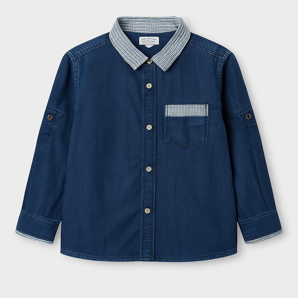 Questa elegante camicia in jeans è un'aggiunta fantastica al guardaroba del tuo piccolo! Realizzata in denim resistente, offre un look casual e alla moda. Il collo a quadretti aggiunge un tocco di originalità, mentre la taschino sul petto la rende pratica e trendy. Le maniche lunghe, perfette per le fresche giornate, possono essere facilmente arrotolate per un look più rilassato. Nonostante sia usata, si presenta in ottime condizioni e sarà perfetta per ogni avventura quotidiana o per un'uscita speciale. Un capo versatile che non può mancare!