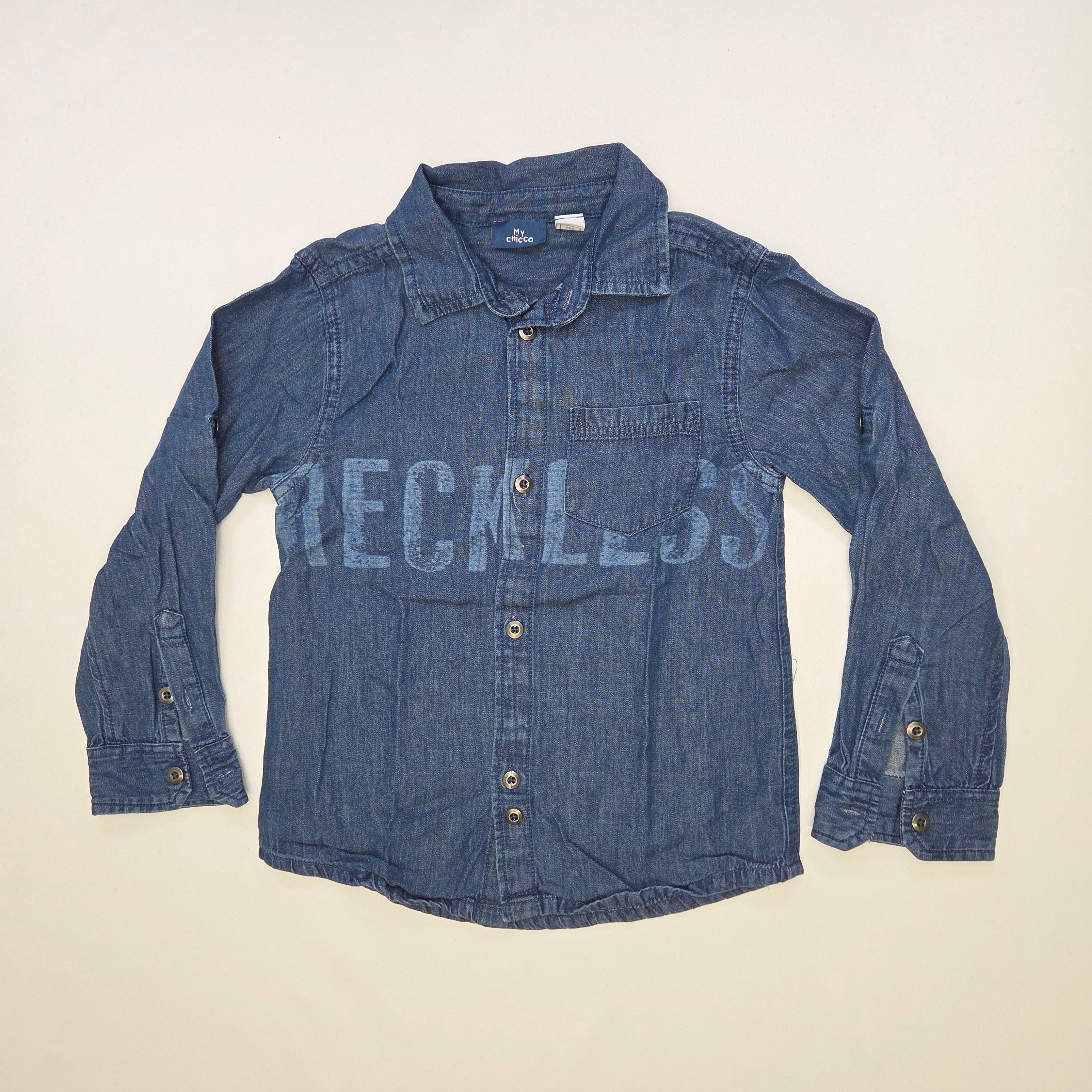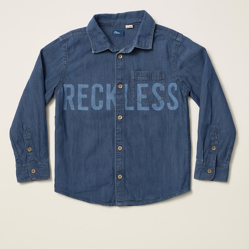 Questa camicia in denim, ideale per i piccoli esploratori, unisce stile e comfort in un colpo solo! Realizzata in morbido cotone, presenta un bel tono blu classico e un'ispirazione casual. La scritta “RECKLESS” sul davanti aggiunge un tocco di personalità, perfetta per i bambini che amano distinguersi. Il design a maniche lunghe e i bottoni frontali la rendono versatile per ogni occasione: un incontro con gli amici, una passeggiata nel parco o un giorno di scuola. Nonostante sia un capo usato, si presenta in ottime condizioni, pronta a essere indossata da un piccolo trendsetter!
