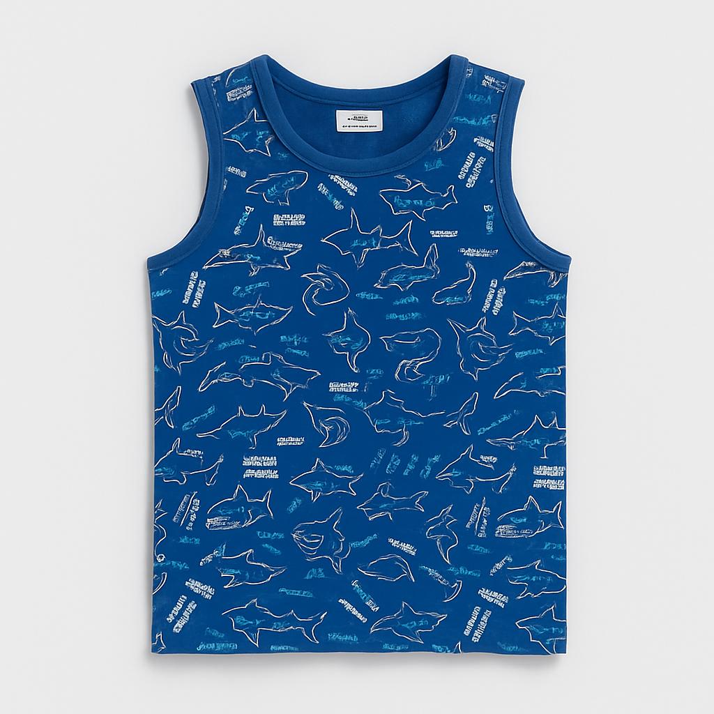 Questo divertente canottiera azzurra farà felice ogni piccolo amante del mare! Realizzata in morbido cotone, è decorata con un vivace motivo che raffigura squali e pesci, perfetta per stimolare la fantasia. Il design senza maniche garantisce freschezza e libertà di movimento durante le calde giornate estive. Nonostante sia un capo usato, si presenta in ottime condizioni ed è ideale per avventure al parco o giochi in spiaggia. Un'aggiunta imperdibile per il guardaroba di ogni bambino!