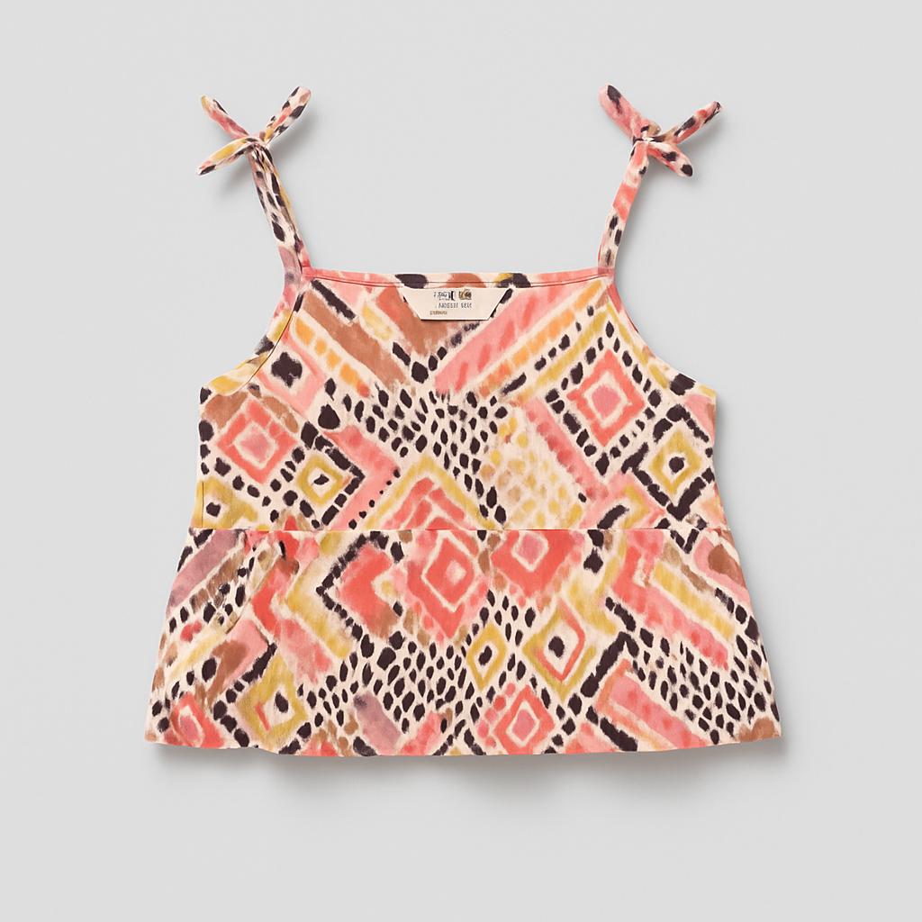 Questa adorabile canotta per bambina è perfetta per le giornate estive! Con un vivace motivo geometrico in tonalità rosa, beige e marrone, è un capo fresco e trendy. Le spalline regolabili rendono la vestibilità comoda e praticabile, mentre il delicato volants in fondo aggiunge un tocco di dolcezza. Leggera e ariosa, è ideale per giocare al parco o per un picnic con gli amici. Nonostante sia usata, si presenta in ottime condizioni e ready-to-wear per piccole trendsetter!