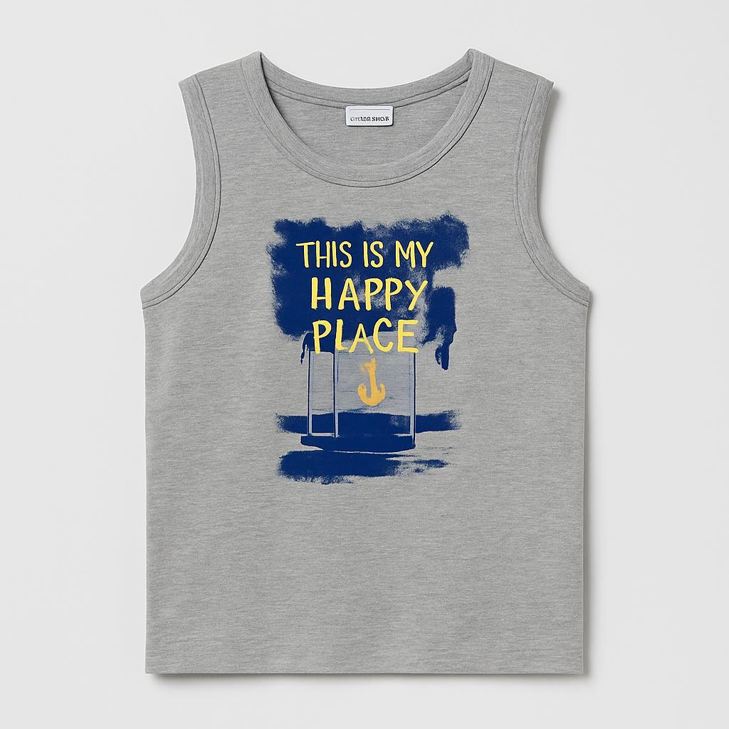 Scopri questa adorabile canotta grigia, perfetta per le giornate estive dei piccoli! Realizzata in morbido cotone, la maglietta presenta una divertente grafica sul davanti con la scritta "This is my happy place", ideale per evocare sorrisi e giochi spensierati. La manica corta e il taglio comodo rendono questo capo perfetto per giocare all'aperto o per una passeggiata. Nonostante sia un capo usato, si presenta in ottime condizioni e rappresenta un'aggiunta pratica e stilosa al guardaroba di ogni bambino. Un must per i piccoli esploratori!
