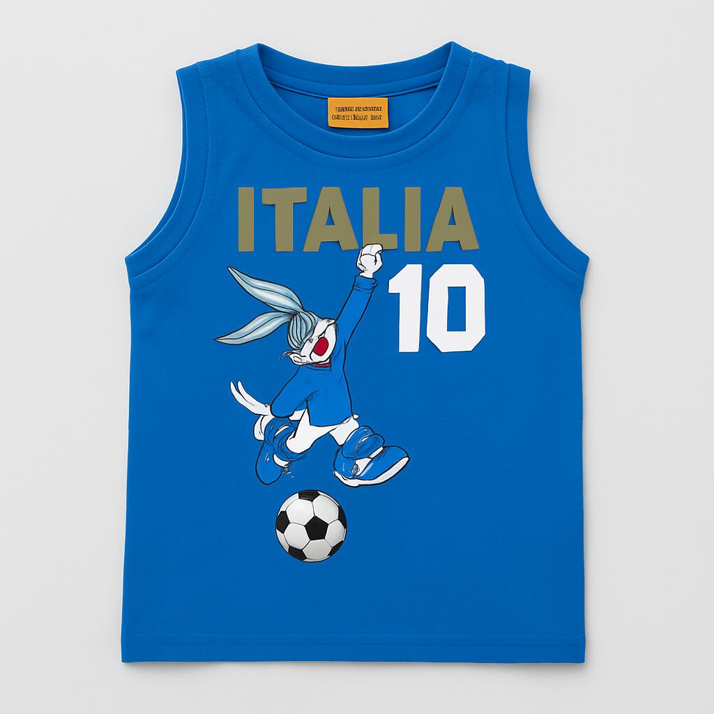 Questa adorabile canotta azzurra, decorata con il mitico Bugs Bunny, è perfetta per i piccoli amanti del calcio! Con il numero 10 e la scritta "ITALIA", questa maglietta in cotone è ideale per le giornate estive e per giocare con gli amici. Il design vivace e il materiale morbido assicurano comfort e libertà di movimento, rendendola un must-have per ogni piccolo sportivo. Anche se usata, si presenta in ottime condizioni e pronta a portare tanta energia e divertimento nel guardaroba dei tuoi bimbi!