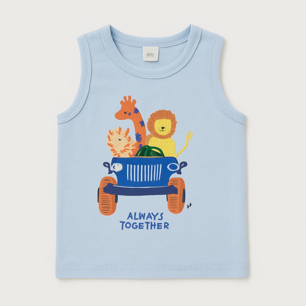 Questo adorabile canottiera azzurra è perfetta per i piccoli esploratori! Realizzata in morbido cotone, presenta un divertente design con una zebrina e un leone pronti per un'avventura in auto. Con la scritta "ALWAYS TOGETHER", questo pezzo invita a condividere momenti felici con amici e famiglia. Le spalline larghe assicurano comfort durante le giornate calde, mentre il colore chiaro la rende facilmente abbinabile. Nonostante sia un capo usato, è in ottime condizioni e pronto per essere indossato da un piccolo aventuriero! Un elemento essenziale per il guardaroba estivo!