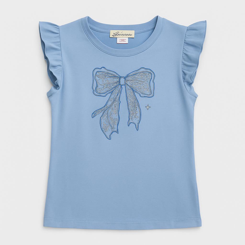 Questa deliziosa t-shirt azzurra è un vero tesoro per il guardaroba delle piccole! Realizzata in un morbido cotone, la maglietta presenta graziose ruches sulle spalle, che aggiungono un tocco di femminilità. Sul fronte, una scintillante stampa di un fiocco arricchita da perline luccicanti cattura l'attenzione, rendendo ogni outfit speciale.