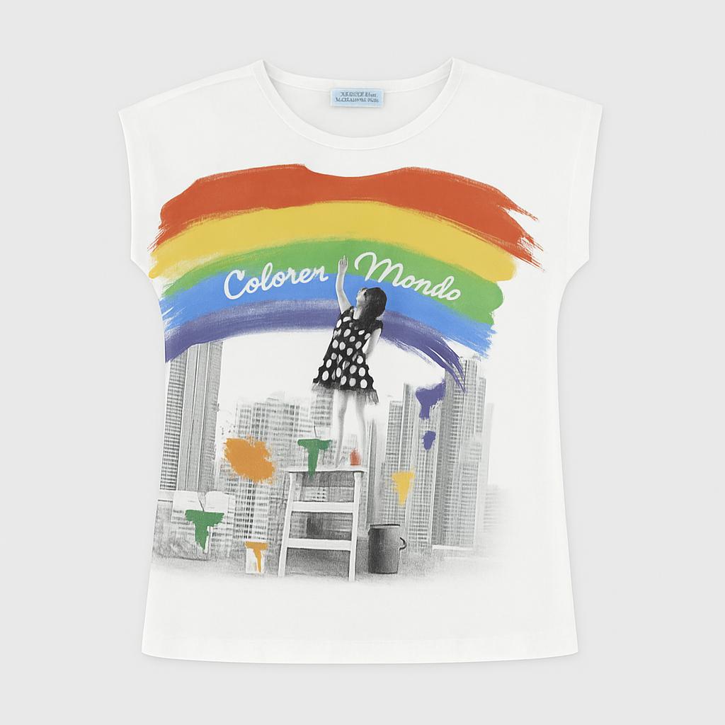 Questa fantastica t-shirt bianca è un vero invito alla creatività! Decorata con una vivace stampa colorata che ritrae una bambina che dipinge un arcobaleno, trasmette aposto di gioia e immaginazione. Il design presenta anche un tocco urbano, con la silhouette di una città sullo sfondo. Le maniche ampie e il taglio confortevole la rendono perfetta per ogni avventura, dalle giornate di gioco a scuola alle uscite con gli amici. Nonostante sia un capo usato, si presenta in ottime condizioni e pronto a far brillare il guardaroba della tua piccola artista! Un must per chi ama esprimere il proprio stile con un pizzico di colore!