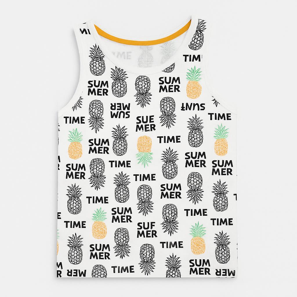 Questa simpatica canotta a tema estivo renderà il guardaroba del tuo bimbo davvero irresistibile! Realizzata in morbido cotone, presenta un vivace motivo di ananas e scritte che evocano la dolcezza dell'estate. La combinazione di bianco, giallo e nero dà vita a un look fresco e divertente, perfetto per le giornate di sole. Con spalline larghe e un taglio comodo, è ideale per correre, giocare e divertirsi. Nonostante sia un capo usato, si trova in ottime condizioni, pronto per nuove avventure! Un must-have per i piccoli amanti del sole e dell'estate!