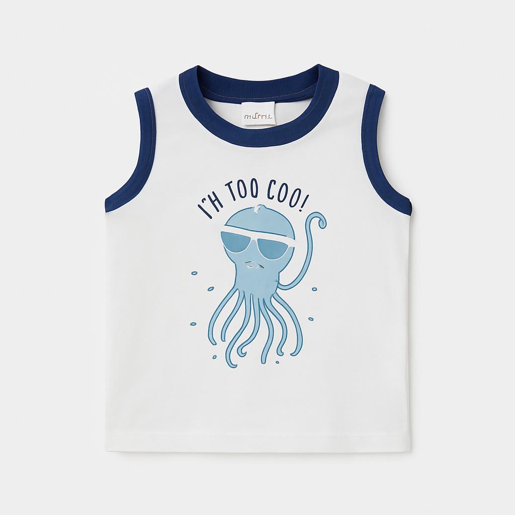 Questa simpatica canottiera bianca è perfetta per i piccoli amanti dell'acqua! Con un divertente messaggio "I'M TOO COOL" e una medusa stilizzata, aggiunge un tocco giocoso al look. I bordi blu conferiscono un bel contrasto, mentre il cotone leggero garantisce comfort durante le calde giornate estive. Usata ma in ottime condizioni, è l'ideale per gironzolare in giardino o al parco. Un capo must-have per i bimbi che amano esprimere la loro personalità!