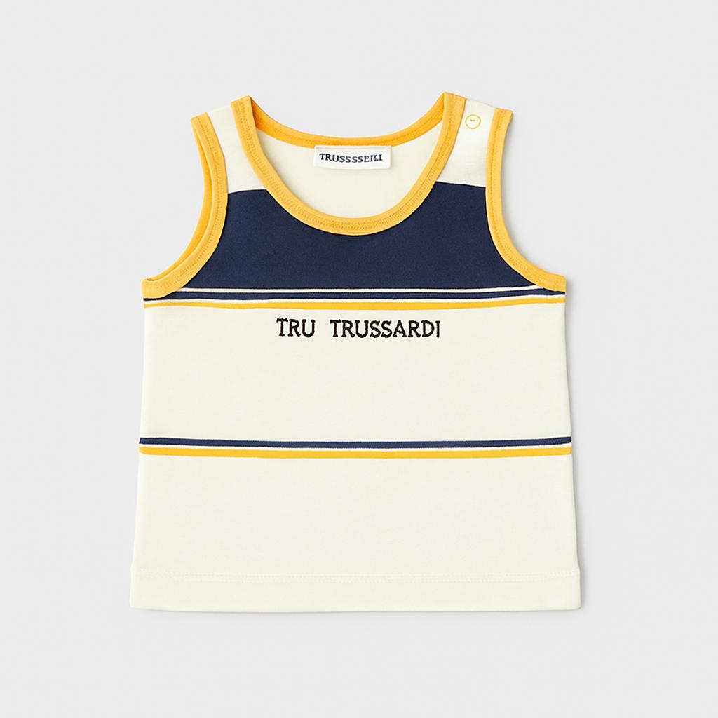 Scopri questa simpaticissima canotta di Trussardi, ideale per le giornate di sole! Realizzata in morbido cotone, presenta un vivace mix di colori bianco, blu e giallo, perfetta per ogni piccolo avventuriero. La scritta "Tru Trussardi" sul davanti aggiunge un tocco di stile e originalità. Con le spalline larghe e il pratico bottone sul colletto, è facile da indossare e garantisce comfort durante il gioco. Un capo usato ma in ottime condizioni, che regalerà a tuo bambino un look trendy e alla moda!