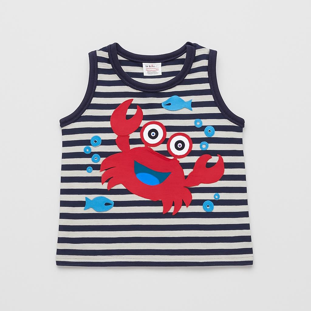 Questa divertente canotta estiva è perfetta per i piccoli amanti del mare! Con una vivace stampa di granchio rosso e pesciolini blu su uno sfondo a righe bianche e nere, porta un tocco di allegria e originalità. Il taglio senza maniche garantisce freschezza e libertà di movimento, ideale per le avventure estive e i giochi all'aria aperta. Nonostante sia un capo usato, si presenta in ottime condizioni, pronto a far brillare il guardaroba del tuo bambino. Un must-have per i piccoli esploratori!