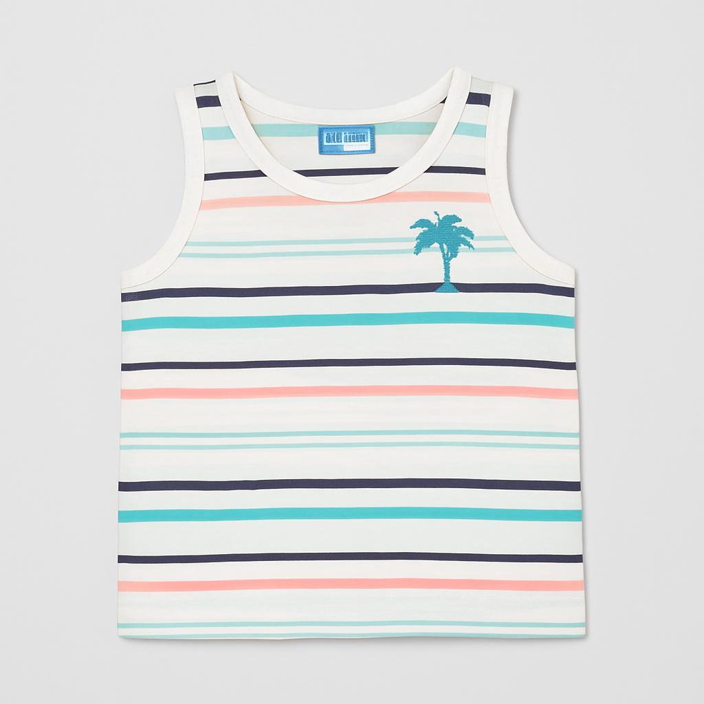 Questa fresca canotta a righe è perfetta per le giornate estive! Realizzata in morbido cotone, presenta tonalità delicate di blu, rosa e verde che ricordano il sole e il mare. Un grazioso palmeto stampato sul petto aggiunge un tocco esotico e giovanile. Le spalline larghe garantiscono comodità e libertà di movimento, ideale per le avventure all’aperto. Nonostante sia un capo usato, è in ottime condizioni e pronta a far brillare il guardaroba del tuo piccolo. Un must-have per ogni piccolo esploratore!