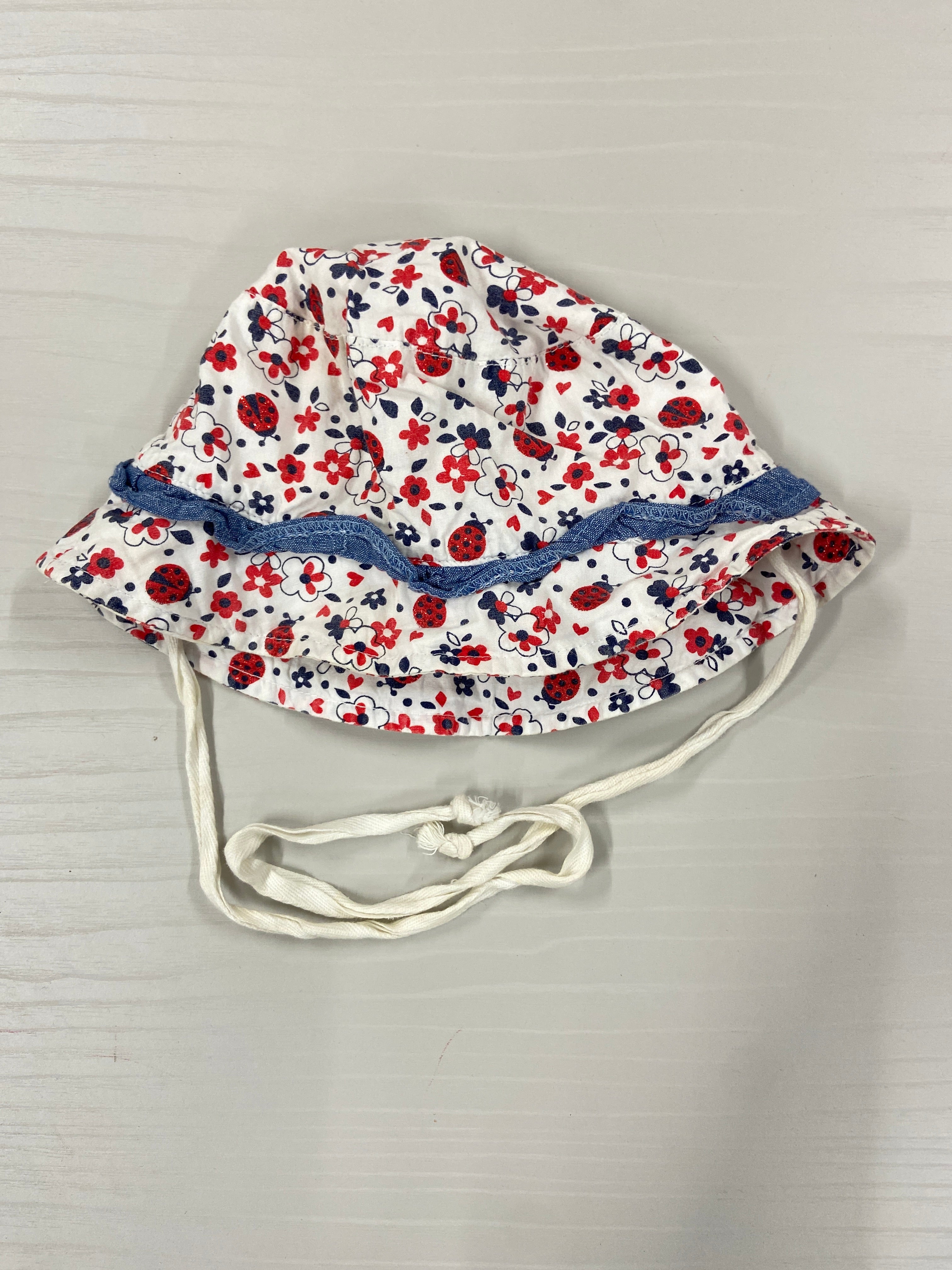Questo adorabile cappellino in cotone è perfetto per le giornate di sole! Caratterizzato da un dolce motivo floreale bianco con affascinanti coccinelle rosse, aggiunge un tocco di allegria al guardaroba dei più piccoli. La fascia blu a contrasto e le stringhe laterali garantiscono una vestibilità sicura e comoda. Nonostante sia un capo usato, presenta ottime condizioni, pronto per accompagnare le avventure estive dei bimbi, proteggendoli con stile e freschezza! Un accessorio imperdibile per ogni piccola esploratrice!