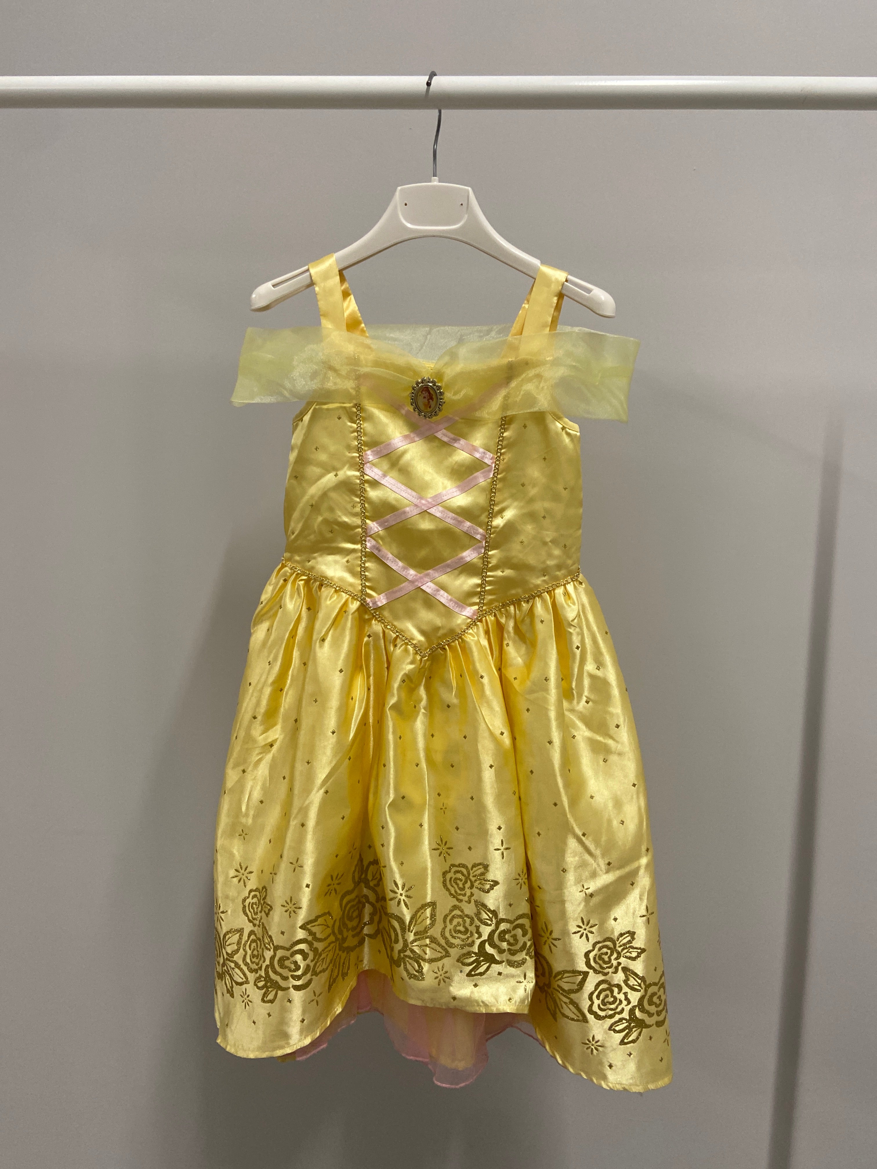 Questo incantevole abito giallo in stile principessa è perfetto per le piccole sognatrici! Ispirato alla favola di Belle, il vestito presenta dettagli delicati, come una delicata spilla sullo scollo e merletti dorati che lo decorano. La gonna ampia e vaporosa è realizzata in un tessuto lucido che brilla ad ogni movimento, mentre le spalline sottili aggiungono un tocco di eleganza. Perfetto per giochi di fantasia, feste di compleanno o semplicemente per sentirsi una vera principessa. Nonostante sia usato, si presenta in ottime condizioni e pronto per nuove avventure magiche!