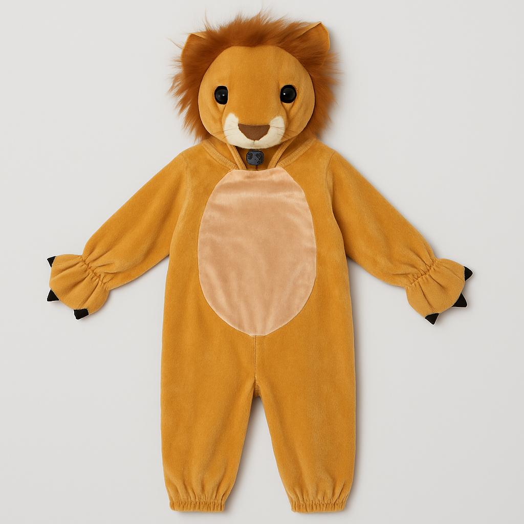 Questo fantastico costume da leone è perfetto per le piccole star in cerca di avventure! Realizzato in morbido tessuto peluche color miele, questo costume avvolgerà il tuo bimbo in un abbraccio caldo e coccoloso. La simpatica testa di leone con criniera soffice e dettagli adorabili renderà ogni travestimento da re della giungla ancora più divertente!