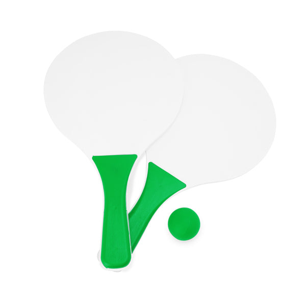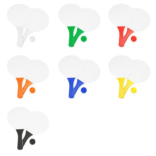 Set di due racchette da spiaggia con una palla. Manici colorati, racchette in bianco e palla in tinta con i manici.