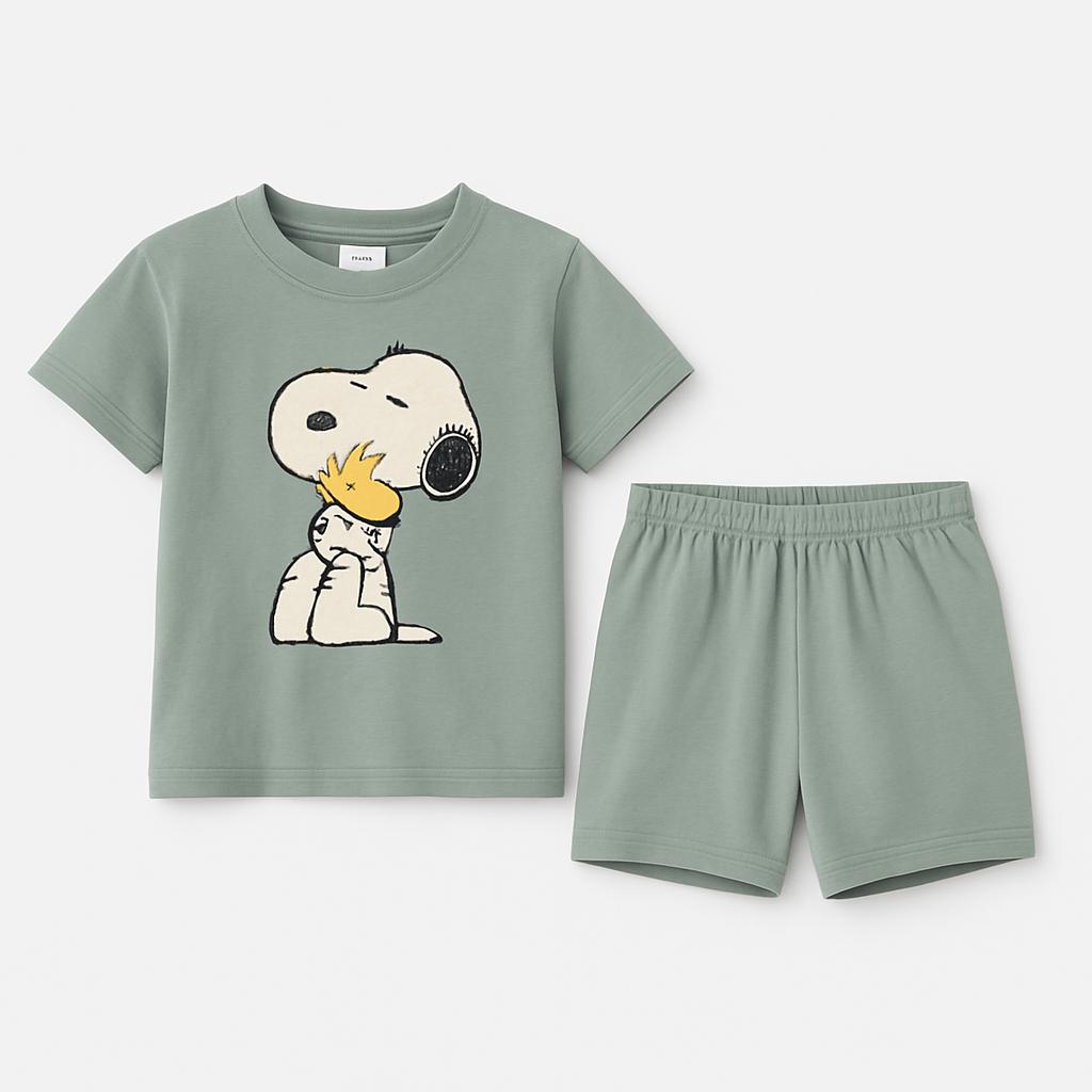Questo adorabile set di abbigliamento per bambini include una t-shirt e pantaloni corti, perfetto per le giornate estive! La maglietta presenta un simpatico Snoopy che ingurgita un delizioso ghiacciolo, portando un sorriso garantito. Realizzata in morbido cotone in un delicato tono verde salvia, è ideale per garantire comfort e freschezza. I pantaloni corti coordinati offrono libertà di movimento, perfetti per le avventure all'aperto. Nonostante sia un capo usato, è in ottime condizioni e pronto per essere indossato da un piccolo amante della moda!