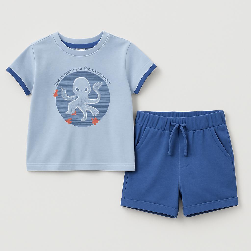 Questo adorabile set composto da una t-shirt e pantaloni corti è perfetto per le avventure estive dei tuoi piccoli! La maglietta azzurra, realizzata in soffice cotone, è decorata con un simpatico disegno di un polpo colorato che cattura subito l'attenzione. Il taglio comodo e le maniche corte la rendono ideale per i giorni di sole.