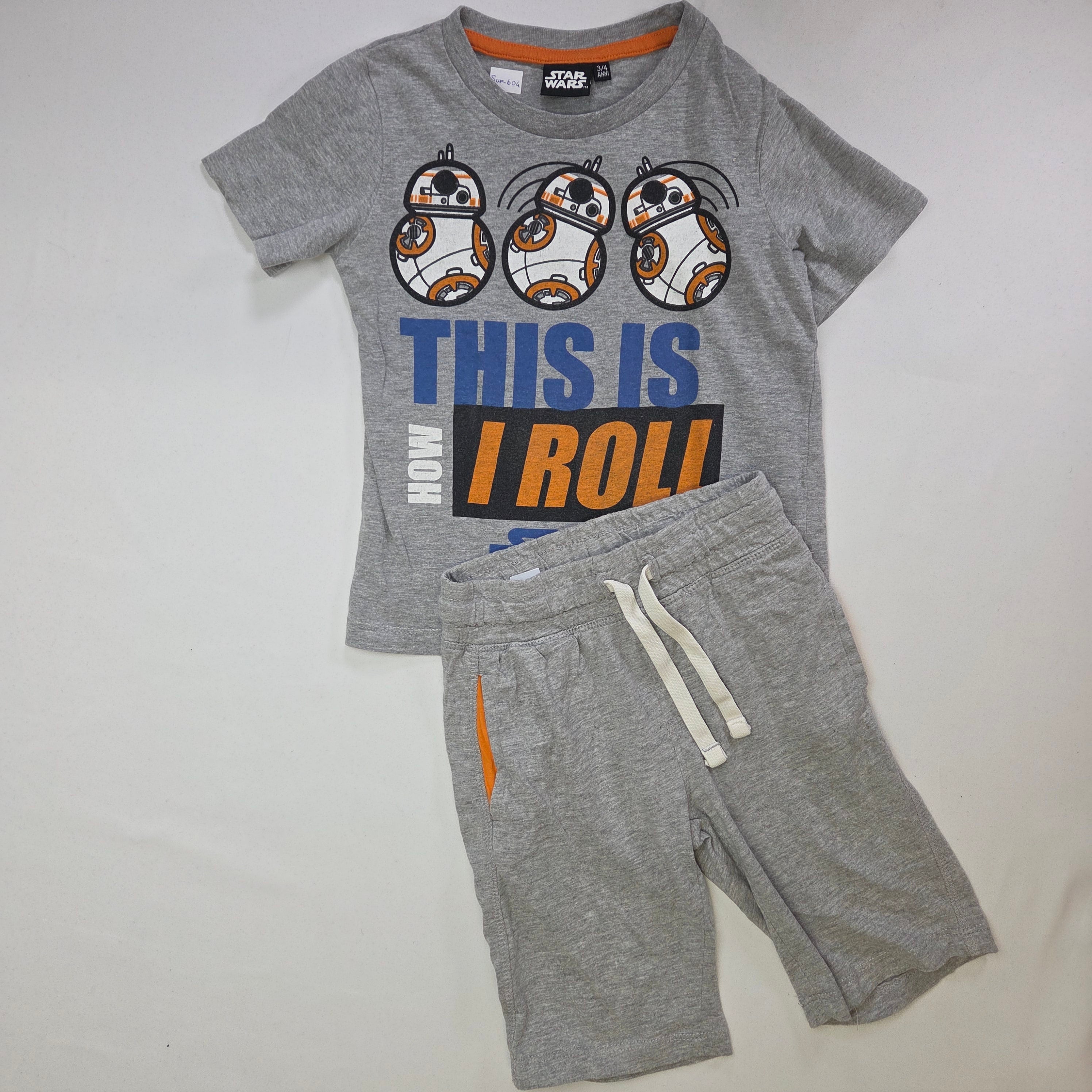 Questo set di t-shirt e pantaloni corti di Star Wars è perfetto per i piccoli Jedi! La t-shirt grigia, in cotone morbido, presenta un divertente design con i famosi droidi BB-8 e la scritta "THIS IS HOW I ROLL" che aggiunge un tocco avventuroso. I pantaloni corti abbinati, comodi e pratici, hanno un'accattivante tasca arancione per un tocco di stile extra. Ideale per le giornate di gioco, questo outfit usato si presenta in ottime condizioni, pronto per accompagnare le avventure quotidiane di ogni bambino!