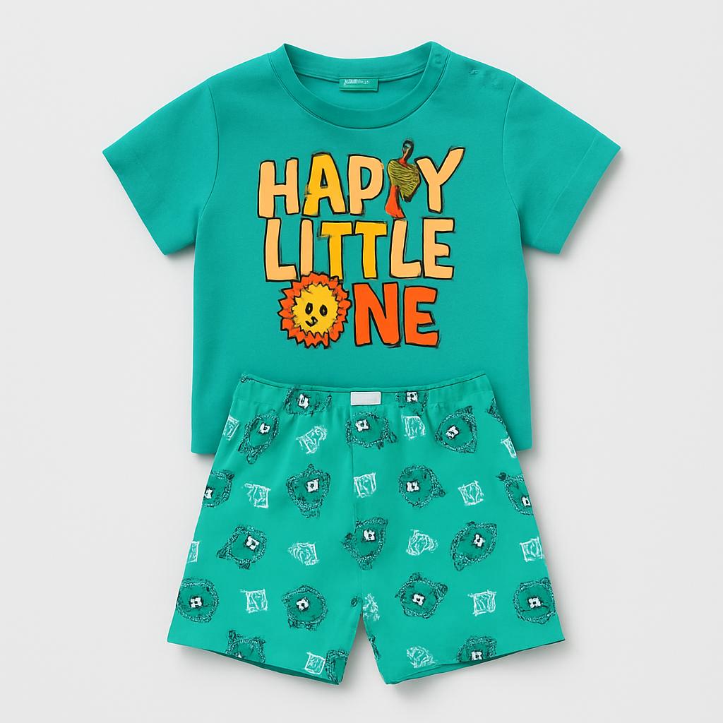 Scopri questo adorabile set composto da una maglietta e pantaloni corti, perfetto per i piccoli esploratori! La maglietta verde brillante, realizzata in cotone morbido, è impreziosita dalla scritta "HAPPY LITTLE ONE" in un mix di colori vivaci, portando sorriso e allegria. I pantaloni corti abbinati, decorati con simpatici motivi di animali, offrono comfort e libertà di movimento, ideali per giocare e divertirsi. Nonostante sia un capo usato, si presenta in ottime condizioni, pronto per nuove avventure! Perfetto per la stagione estiva e per ogni occasione!