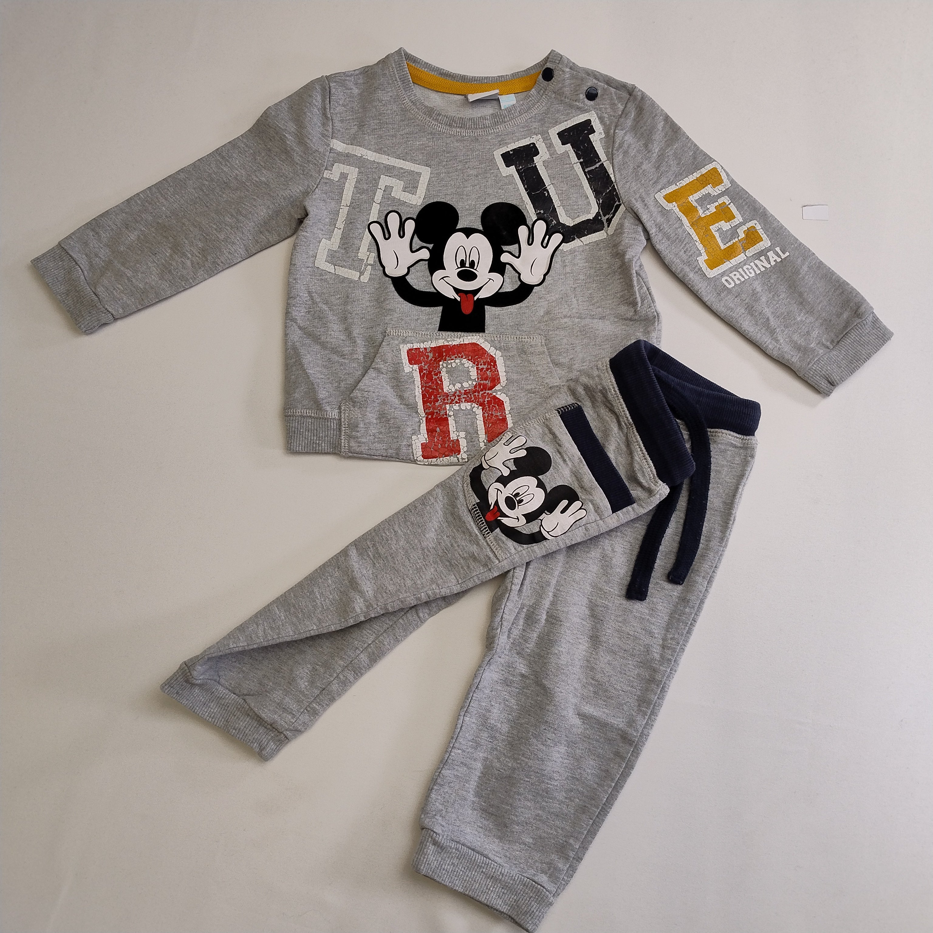 Questo adorabile completo di Mickey Mouse è perfetto per i piccoli fan dei cartoni animati! Realizzato in morbido cotone grigio, comprende una felpa a maniche lunghe con lettura “TRUE” e un vivace Mickey che saluta, rendendolo allegro e originale. I pantaloni abbinati, con dettagli a tema Mickey, offrono comfort e stile in ogni occasione. Il taglio pratico e comodo lo rende ideale per avventure quotidiane in casa o all'aperto. Nonostante sia usato, si presenta in ottime condizioni, pronto per nuove avventure! Un must-have per i piccolini che amano divertirsi con il loro personaggio preferito!