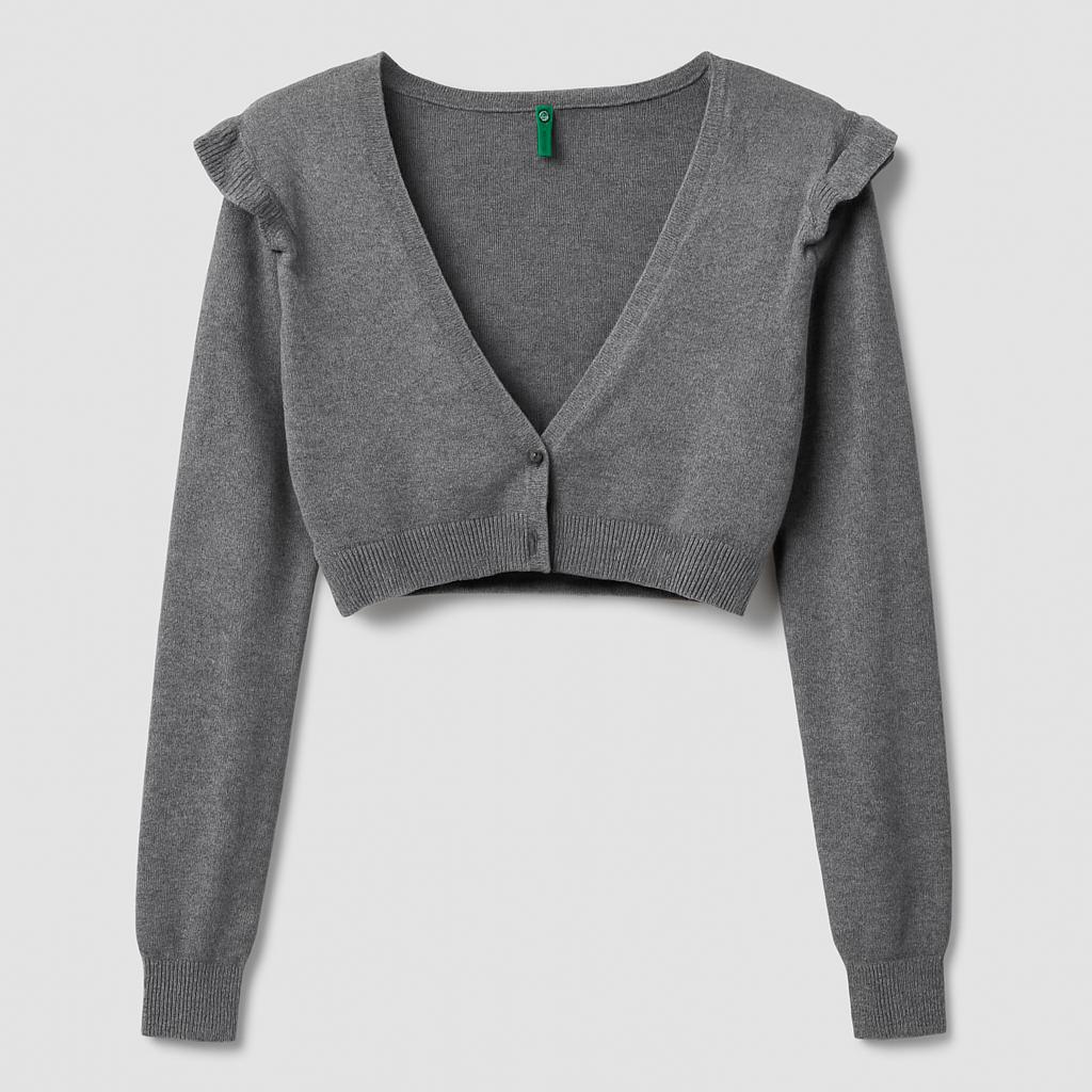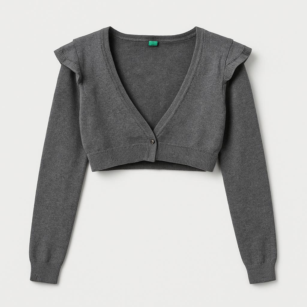 Questo adorabile cardigan grigio è il capo perfetto per le piccole fan della moda! Caratterizzato da un design cropped e maniche lunghe a sbuffo, offre un tocco di eleganza e stile. I delicati volant sulle spalle donano un tocco dolce e femminile, ideale per completare qualsiasi outfit. Realizzato in un caldo tessuto, è perfetto per le giornate fresche o per un look stratificato durante le sere d'estate. Nonostante sia un capo usato, si presenta in ottime condizioni, pronto per accompagnare molte avventure! Un must-have per le piccole trendsetter!