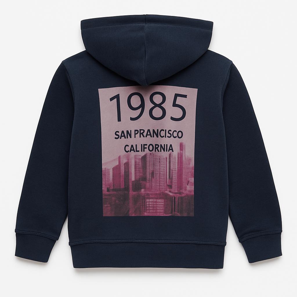 Ecco un delizioso felpa per bambini che porta un tocco di avventura e stile al guardaroba dei più piccoli! Di un elegante blu scuro, questa felpa è ideale per le fresche giornate primaverili. Sul retro presenta una grafica vivace che celebra San Francisco con l'anno "1985", richiamando atmosfere creative e urban chic. Il cappuccio aggiunge un elemento trendy, perfetto per le piccole esploratrici e gli avventurosi. Nonostante sia un capo usato, si trova in ottime condizioni, pronto per accompagnare il tuo bimbo in mille avventure quotidiane!