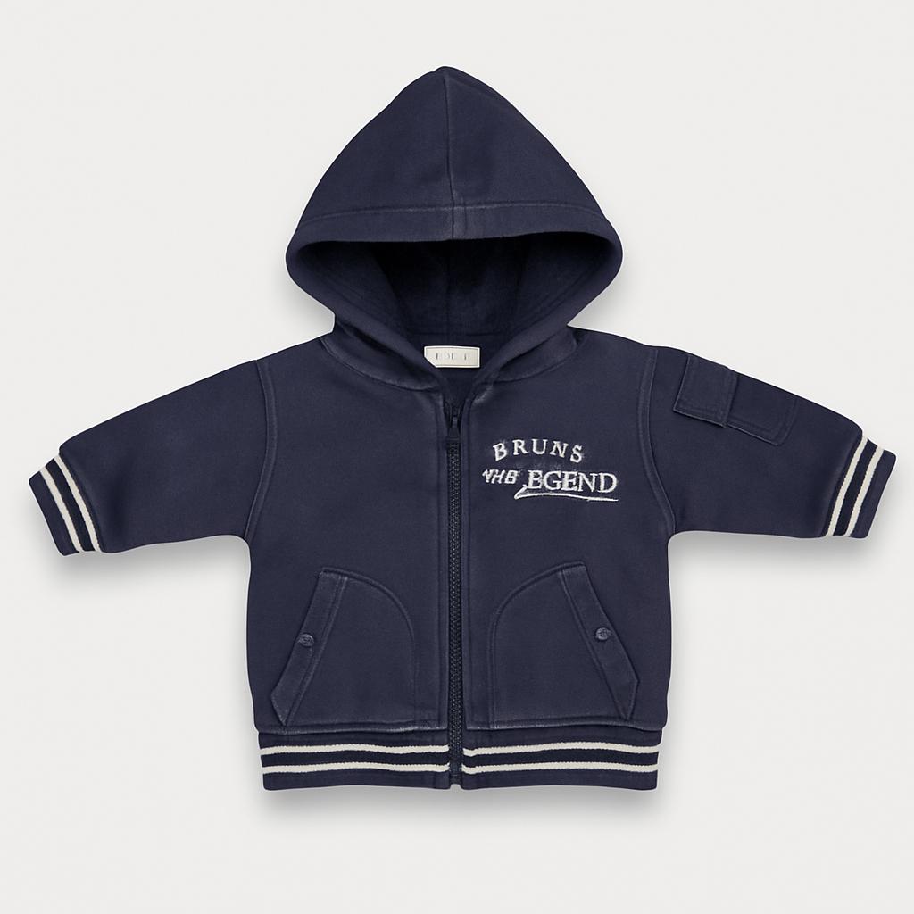 Questo adorabile giubbotto con cappuccio è un vero tesoro per i piccoli esploratori! Realizzato in morbido cotone, il suo elegante colore blu scuro lo rende facile da abbinare a qualsiasi outfit. Con delle accattivanti righe bianche sui polsini e sul fondo, conferisce un tocco sportivo e trendy.