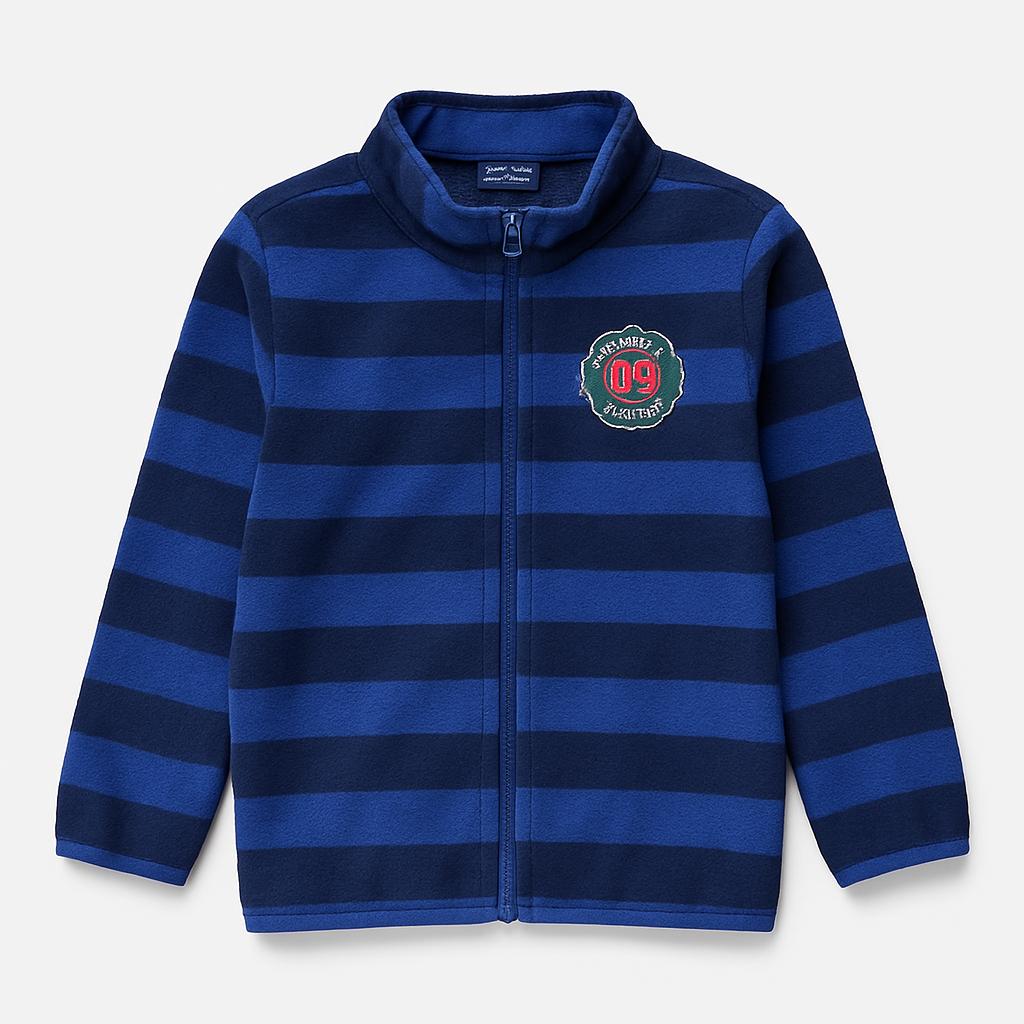 Questo morbido e caldo maglioncino in felpa farà sicuramente felice il tuo piccolo! Caratterizzato da una vivace fantasia a righe blu e nere, è perfetto per affrontare le giornate più fredde con stile. La chiusura a zip e il colletto alto garantiscono comodità e calore, mentre il logo ricamato sul petto aggiunge un tocco sportivo e trendy. Anche essendo un capo usato, si presenta in ottime condizioni, pronto per accompagnare le avventure invernali del tuo bambino. Un must-have nel guardaroba dei piccoli esploratori!