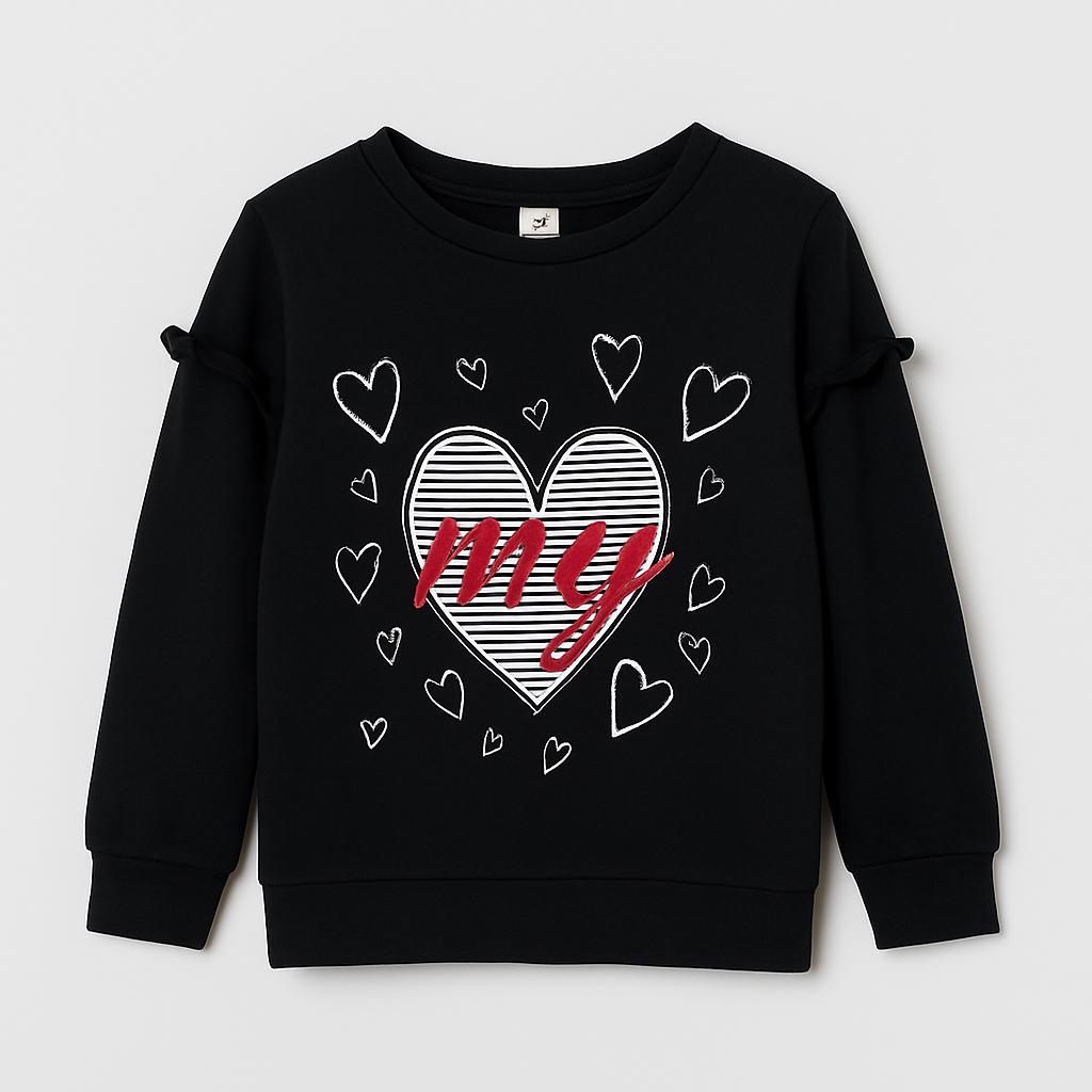 Questa dolcissima felpa nera è un'ottima aggiunta al guardaroba delle piccole! Con un design adorabile, presenta un grande cuore stilizzato e la scritta "my" in rosso che cattura subito l'attenzione. Le maniche sono caratterizzate da graziosi dettagli annodati, perfetti per un tocco di originalità. Realizzata in un morbido cotone, è ideale per le giornate più fresche, mantenendo comfort e stile. Questo capo usato è in ottime condizioni, pronto per accompagnare le avventure quotidiane delle piccole fashioniste!
