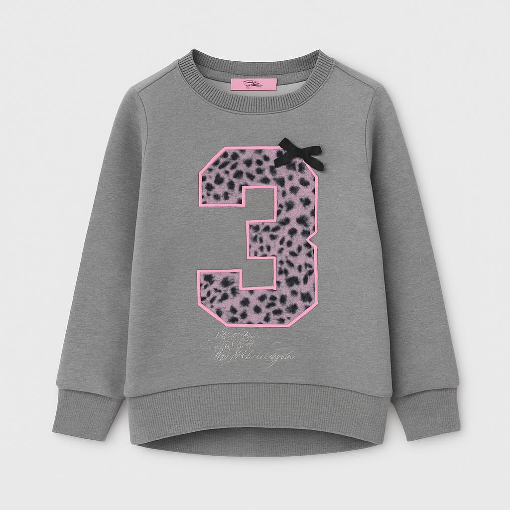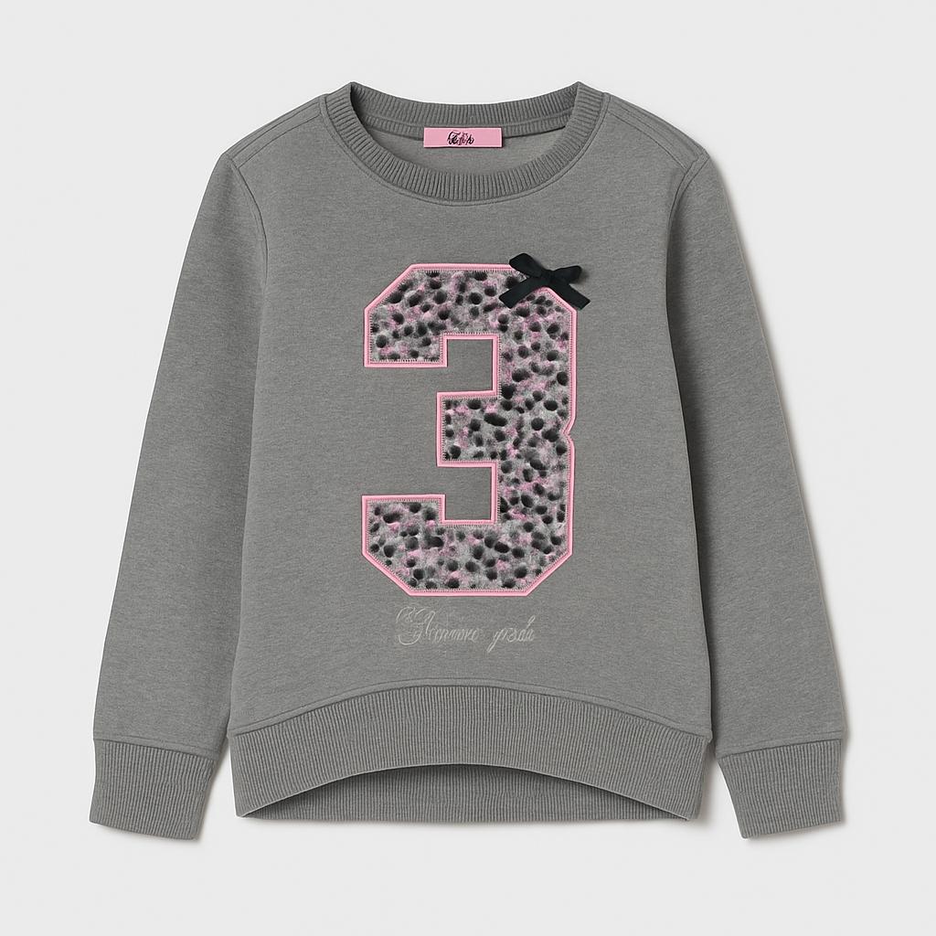 Questo adorabile pullover grigio di OVS è perfetto per le piccole fashioniste! Realizzato in morbido cotone, offre comfort e calore nelle fresche giornate. Il design è vivace, con un grande numero "3" adornato da dettagli floreali e un divertente fiocco nero, che aggiunge un tocco di stile. Il taglio, leggermente lungo dietro, rende questo capo ideale per essere abbinato a leggings o jeans. Usato ma in ottime condizioni, sarà un'ottima aggiunta al guardaroba della tua piccola!