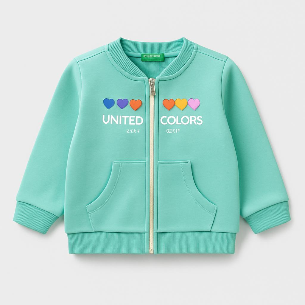 Questo adorabile giubbotto di United Colors of Benetton è perfetto per le piccole esploratrici! Realizzato in un morbido tessuto in cotone, presenta un fresco colore verde acqua che porta una ventata di allegria. La zip frontale rende facile indossarlo e toglierlo, mentre le tasche laterali sono ideali per riporre piccoli tesori. La scritta "United Colors" con cuoricini colorati sul fronte aggiunge un tocco di dolcezza. Nonostante sia un capo usato, si trova in ottime condizioni, pronto a tenere al caldo le tue piccole durante le fresche giornate primaverili! Un must-have per ogni guardaroba!