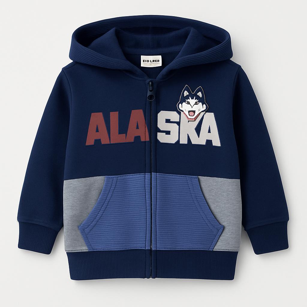 Questo adorabile felpa con zip è perfetta per i piccoli avventurieri! Realizzata in un morbido tessuto, presenta un elegante mix di blu navy e grigio, con l'inconfondibile scritta "ALASKA" e un simpatico logo di un husky. Le tasche frontali aggiungono un tocco pratico mentre il cappuccio tiene al caldo nelle giornate fresche. Nonostante sia un capo usato, si presenta in ottime condizioni, pronto a diventare il nuovo preferito per le esplorazioni quotidiane! Un must per i bimbi che amano stare comodi e alla moda!