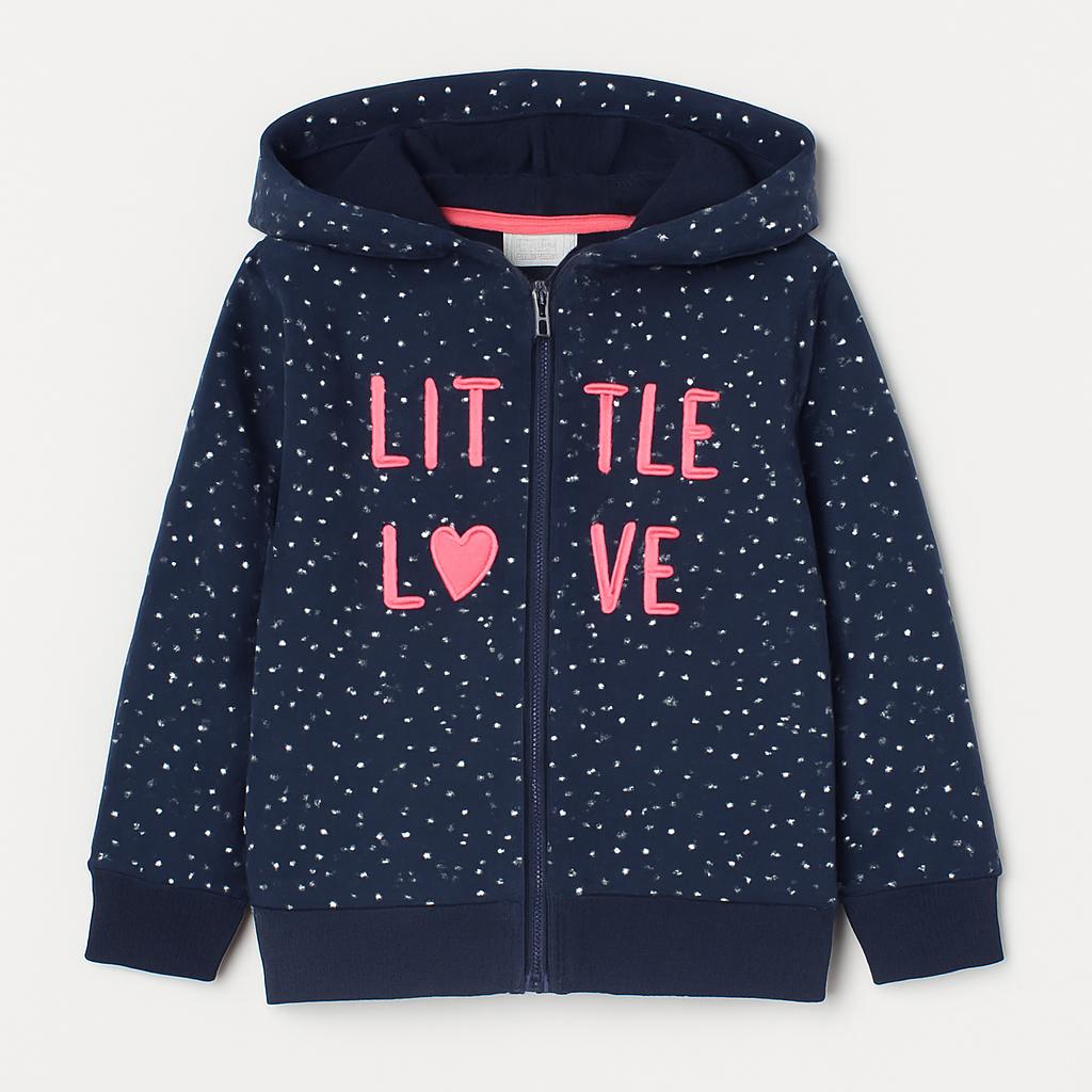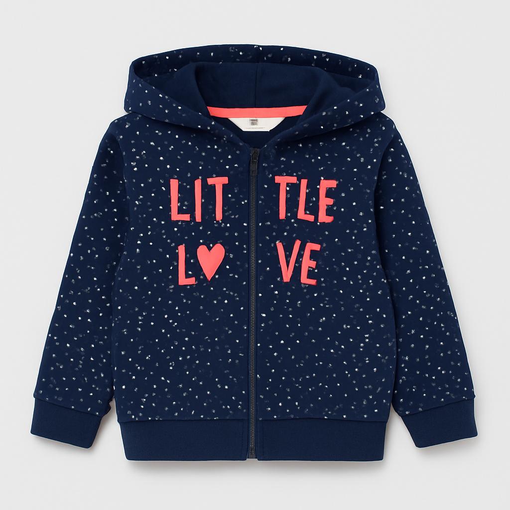 Avvolgi il tuo bimbo in un caldo abbraccio con questa adorabile felpa di marca! Realizzata in un morbido tessuto, questa giacca blu scuro decorata con graziosi pois bianchi è impreziosita dalla scritta "LITTLE LOVE" in un delicato rosa corallo. Con un comodo cappuccio e una chiusura con zip, è perfetta per le avventure quotidiane, le giornate fresche e i momenti di gioco. Nonostante sia un capo usato, si presenta in ottime condizioni e porterà un sorriso sul volto del tuo piccolo. Un must-have per un look trendy e confortevole!
