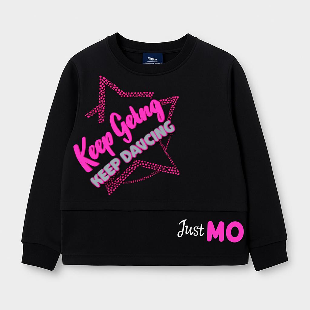 Questa felpa nera di Just MO è perfetta per le piccole ballerine! Con una vivace scritta “Keep Going, Keep Dancing” e una stella scintillante decorata da applicazioni, porta un tocco di magia a qualsiasi outfit. Il morbido tessuto offre calore e comfort, ideale per ballare e giocare senza sosta. Le maniche lunghe e il taglio leggermente svasato la rendono versatile e trendy. Anche se già amata, è in ottime condizioni e pronta per nuove avventure! Non perdere l'occasione di far brillare il guardaroba della tua piccola!